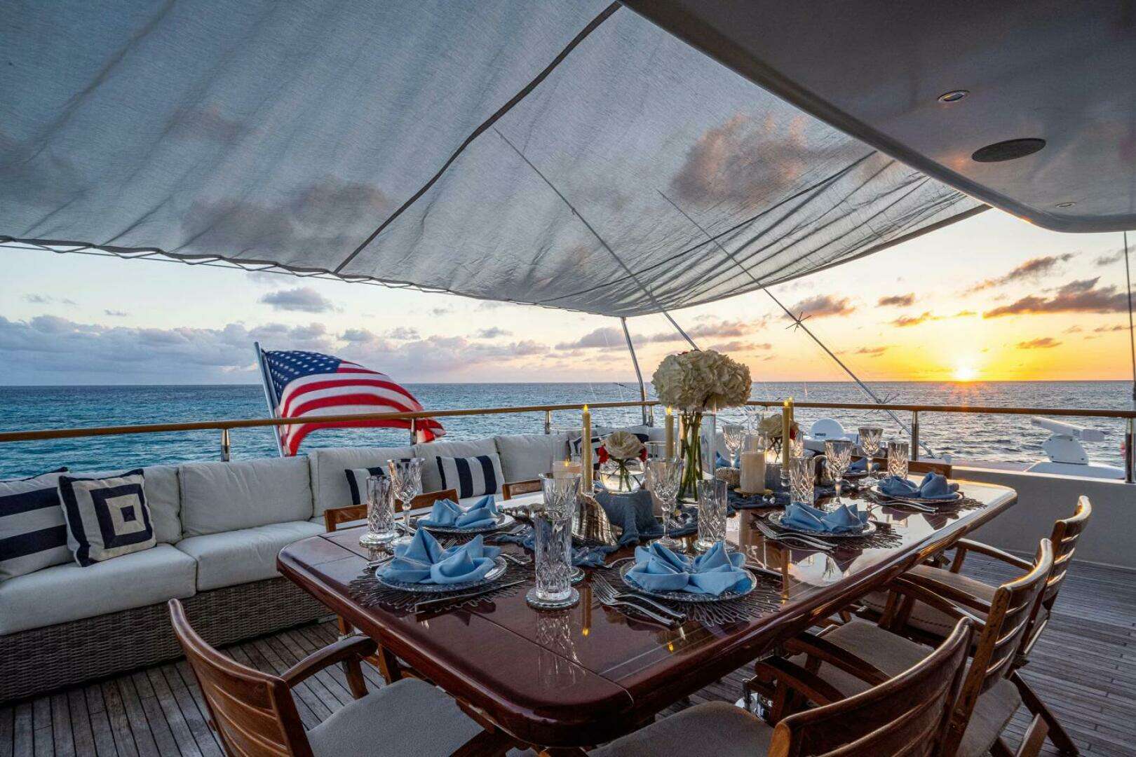 • Aft lounge area with built-in seating, 3 director’s chairs, and occasional tables
