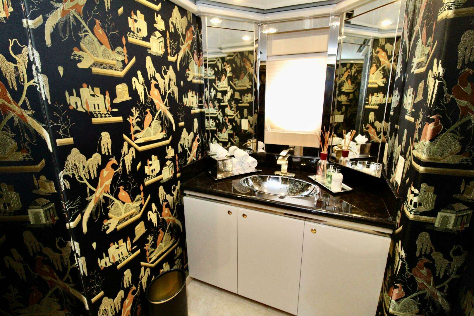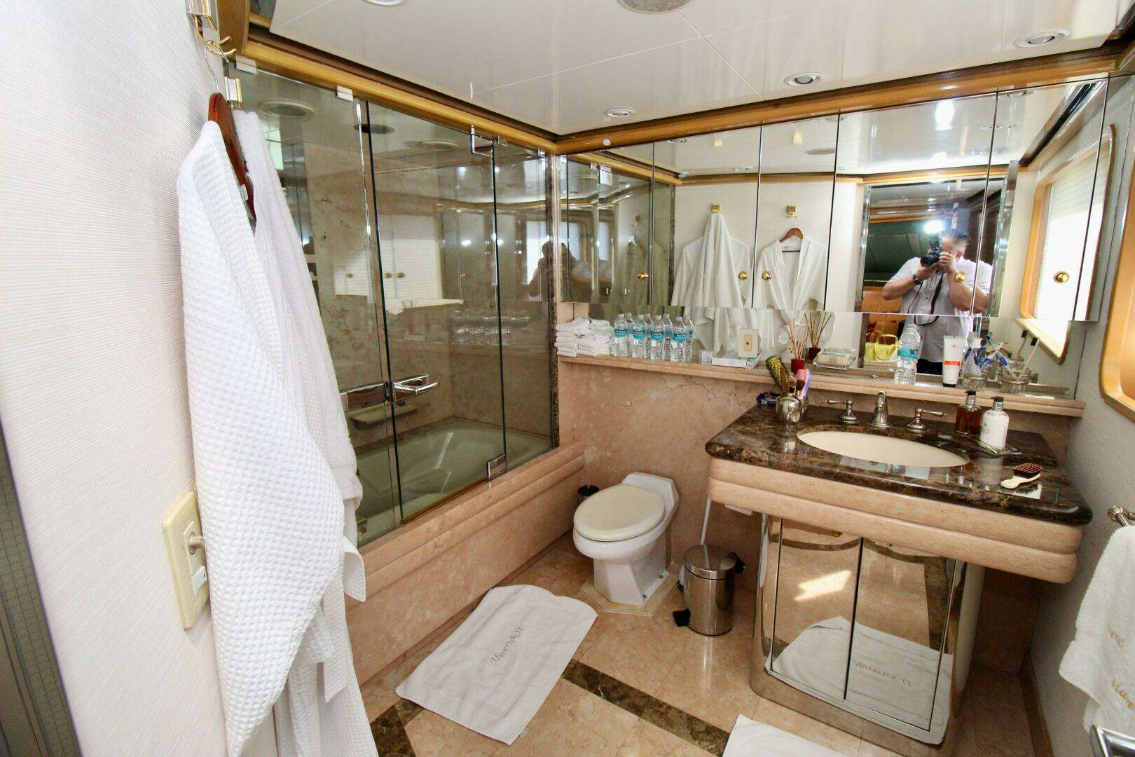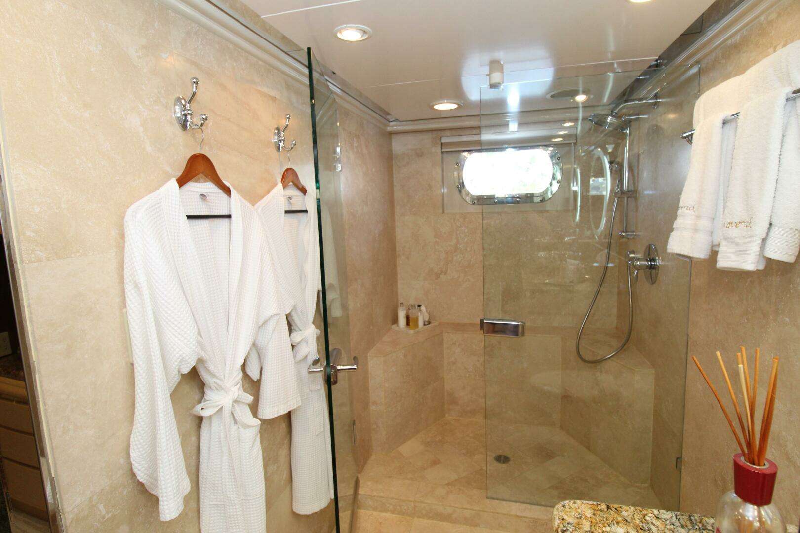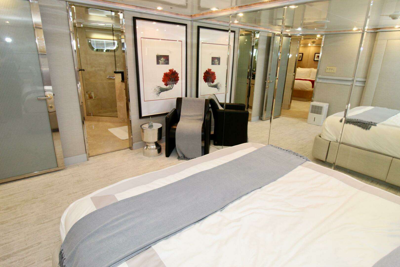 Throughout the vessel, cabins are equipped with 120-volt AC power, recessed in-ceiling “eyeball” light fixtures fitted with LED bulbs, and wall switches with integrated dimmers for customizable lighting. Bedrooms also feature bedside wall-mounted reading lights, while bathrooms are enhanced with backlit LED vanity mirrors, creating a refined and contemporary ambiance.
