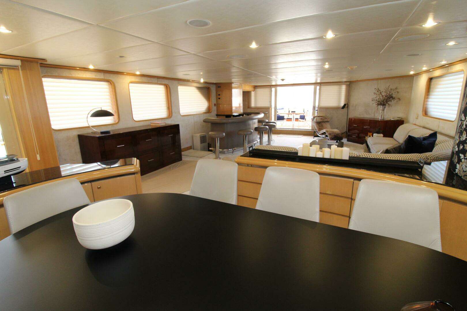 Forward of the salon, the dining area features a substantial table that easily accommodates ten guests with room to spare, making it ideal for formal dining or large gatherings.