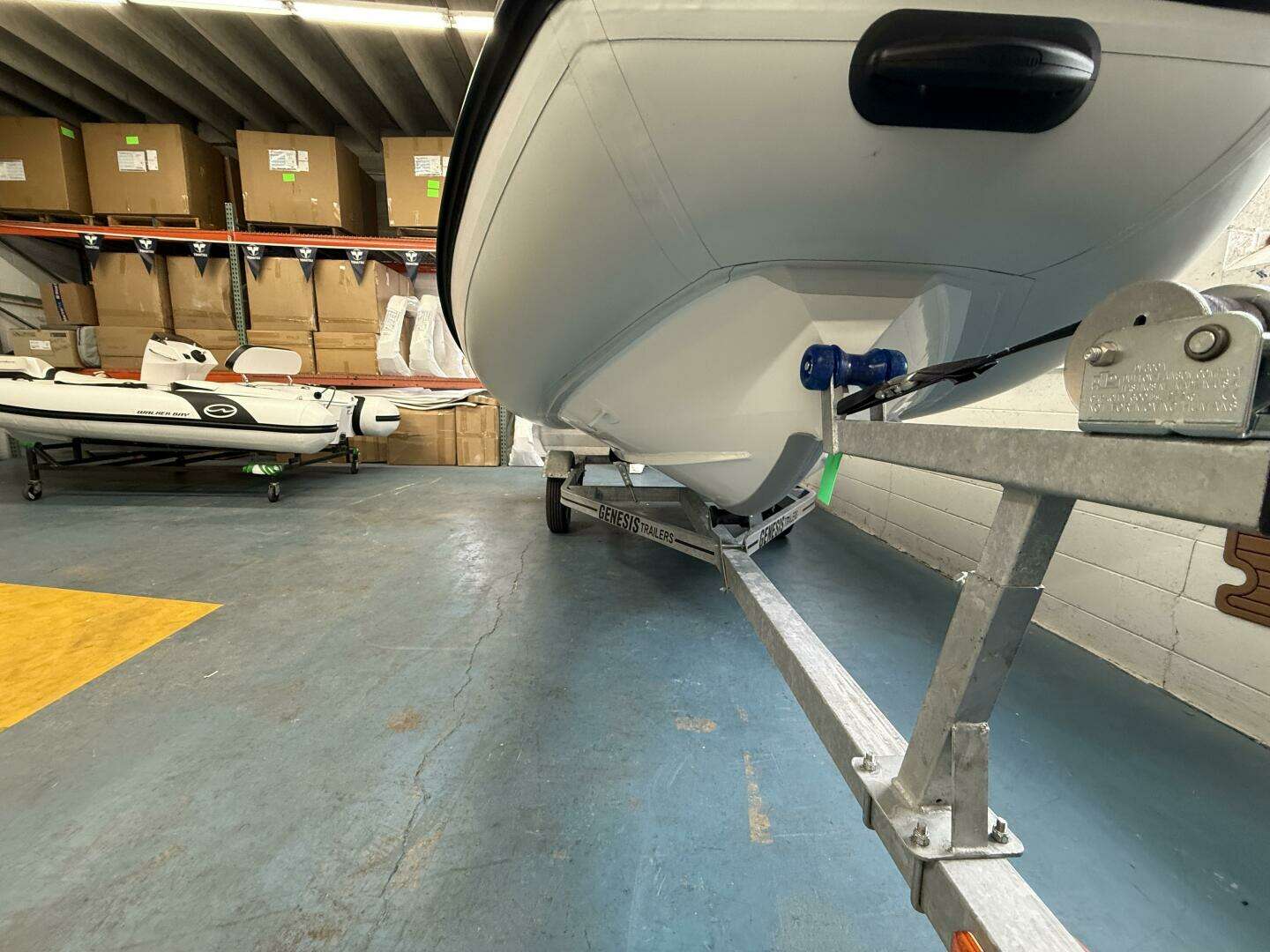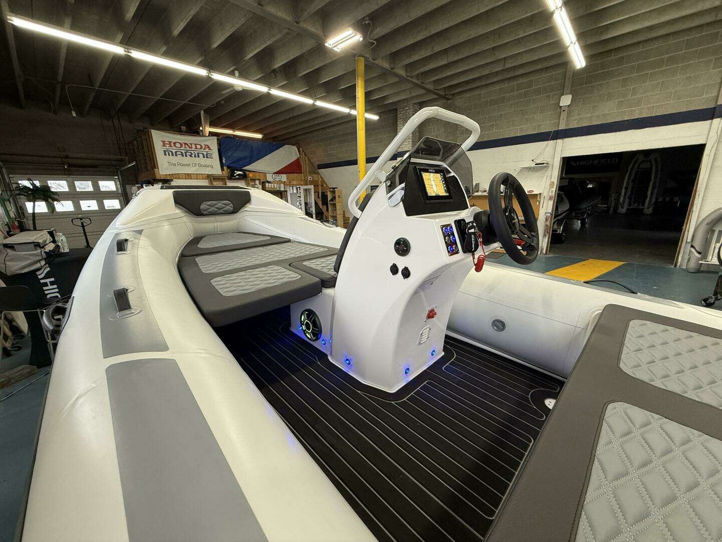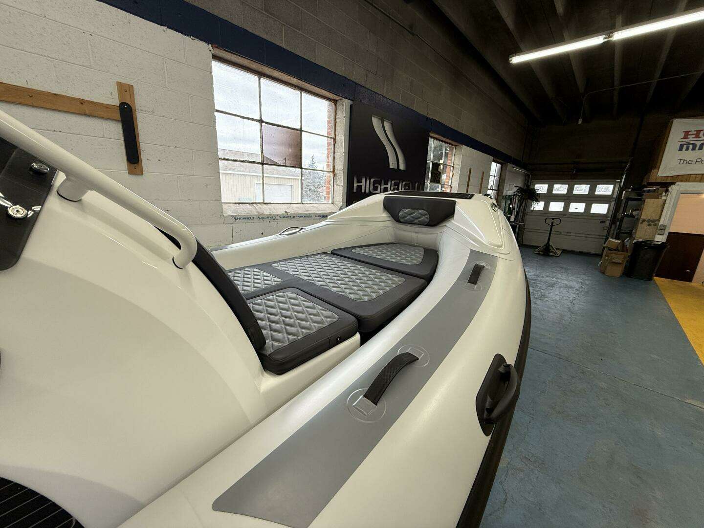 The all new Highfield Sport 420 is similar but a big step up in size and power to the SP390. The perfect combination of luxury features and a dry riding heavy-duty aluminum hull mean the Sport 420 is the best of both worlds in a small tender RIB. The twenty-degree hull with welded lift strakes with the built-in fuel system located under the deck will take you through the roughest conditions and can be brought up on rocky beach with peace of mind, while the luxury diamond stitch cushions make for a comfortable day on the water. The deep rear seat and ergonomic console offer more leg room any other RIB its size and the console includes a tinted windscreen, grab rail and the optional carbon dash. The dash has room for a 9” chart plotter to help with navigation. The bow step is designed to be extra wide for easy boarding, using split double bow nav lights and folding cleats so no tripping hazards. There are four dry storage compartments including an extra deep rear seat area, and all include hydraulic pistons to hold up lids for easy stowing. Rated for 8 persons and 70hp, and incorporating a built in 10.5 gallon fuel system, the New Sport 420 has everything you need in a deluxe tender RIB.