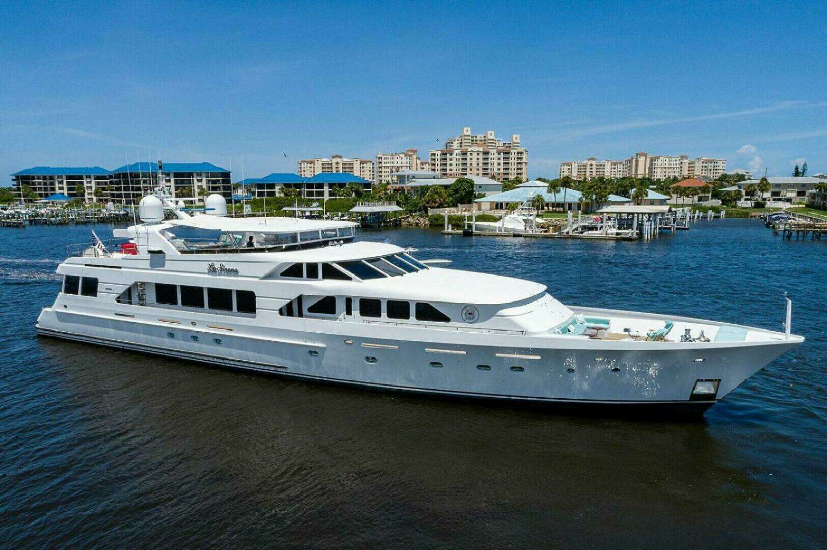 LA SIRENA is an impeccably maintained and a spacious Raised Pilothouse Motor Yacht featuring a massive interior volume with 28 foot beam. A complete refit and update was done in 2024 with a complete new Awlgrip Mattorn White paint job along with her ABS 25-year inspection and survey completed. In addition, the vessel received updated furnishings, electronics and galley appliances. Accommodates nine guests in four staterooms plus three crew cabins. The vessel features an expansive flybridge and huge aft swim platform including Rupp fishing outriggers along with passerelle ladder for Med style docking. This unique pedigree Motoryacht is a rare find and should not be overlooked when searching for a yacht of this caliber and style.