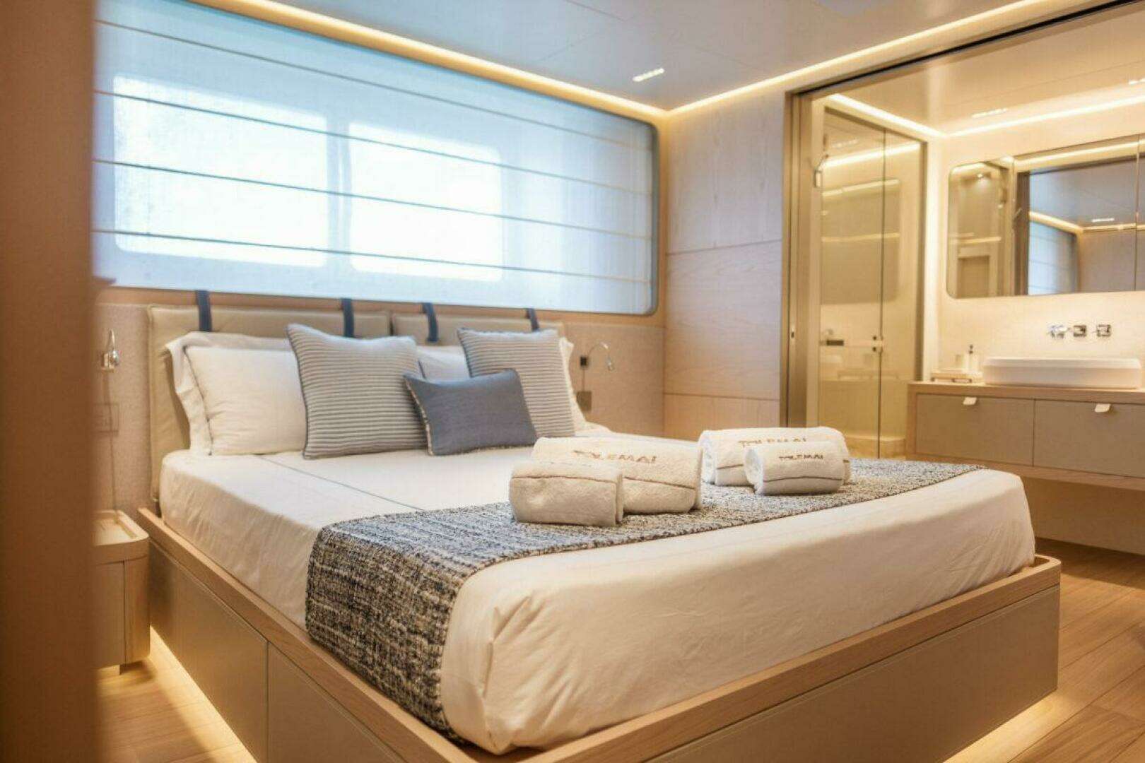 TOLEMAI, a Sanlorenzo 44 X-Space, features 6 staterooms for 12 guests, combining Italian elegance, innovative design, and ultimate comfort.