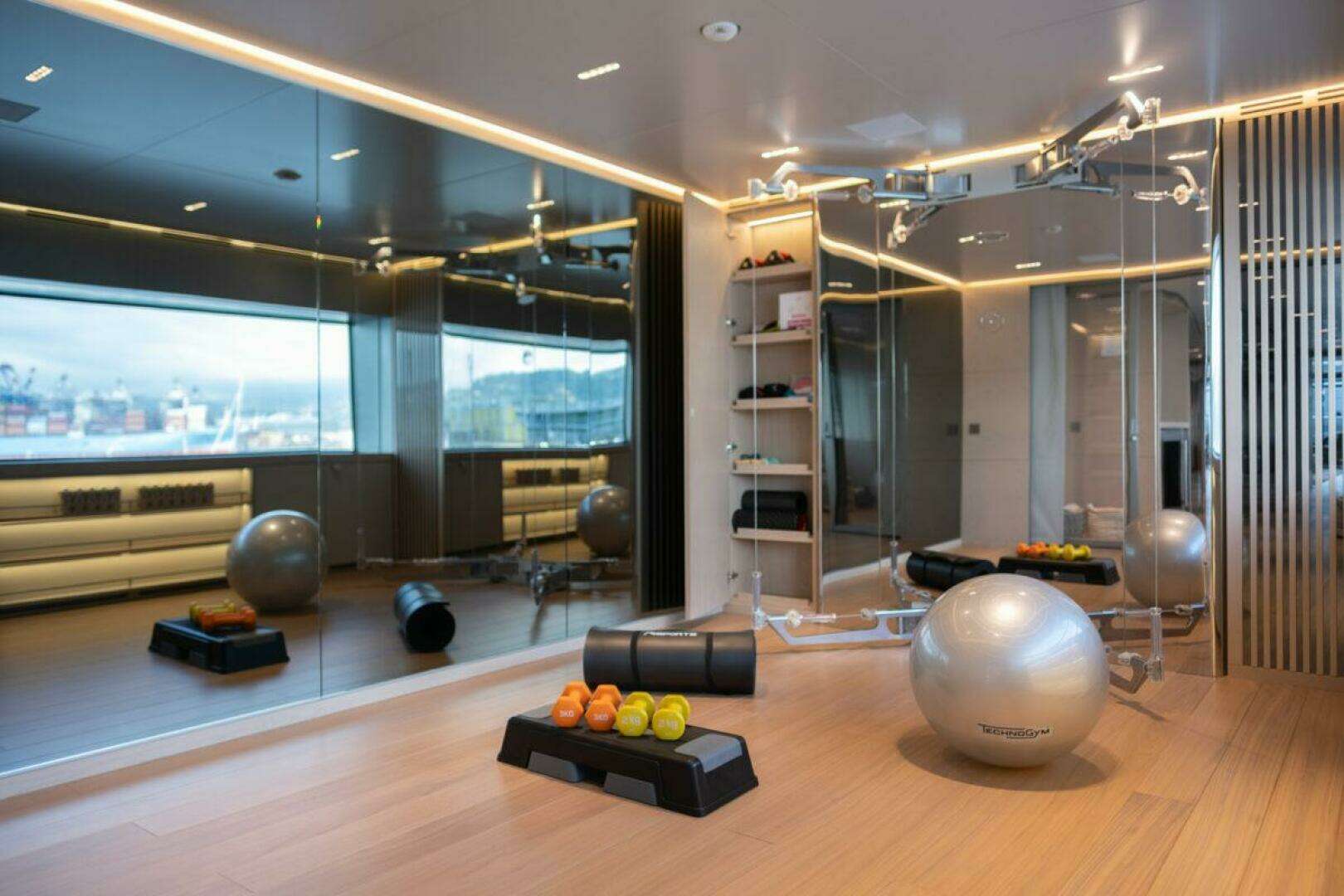 Port side Main Deck forward has a children’s stateroom with 2 single beds and 1 Pullman bed. On the Main Deck starboard side, there is a gym area with a large window and curtains for privacy.