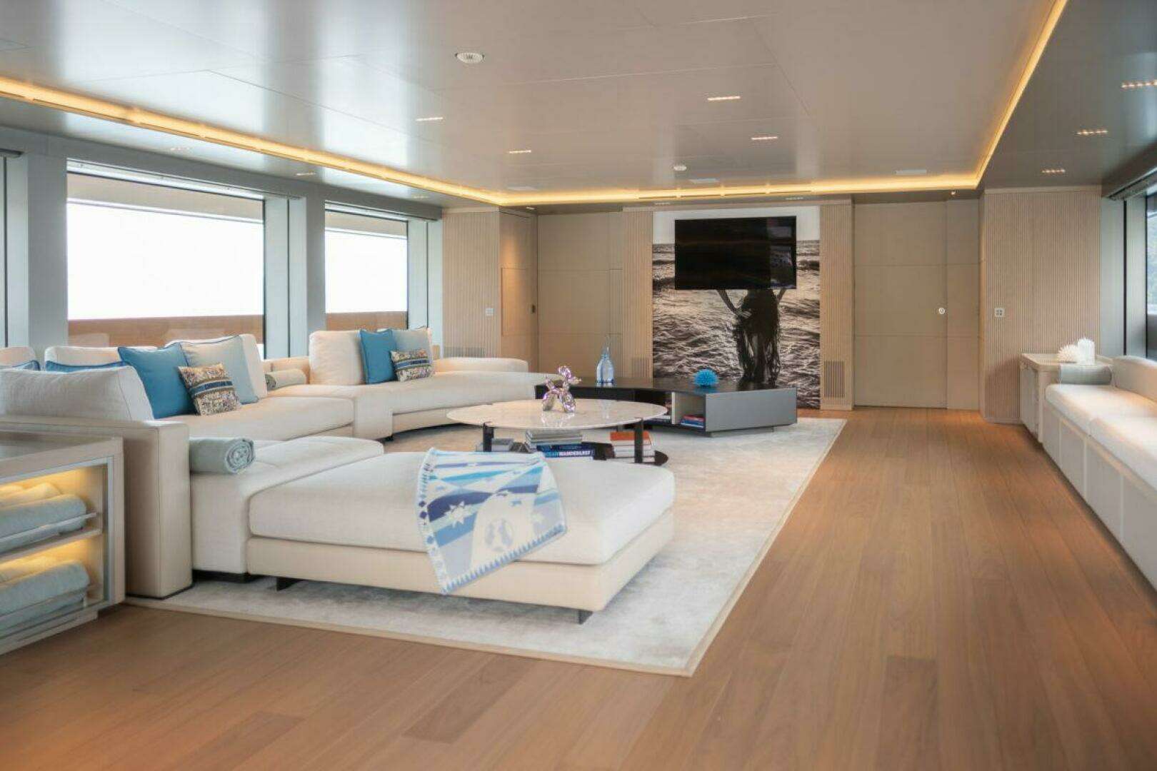 Social spaces feature a main saloon with plush seating and concealed TV, an upper saloon with marble dining for 12, and multiple outdoor decks designed for dining, lounging, and entertaining.
