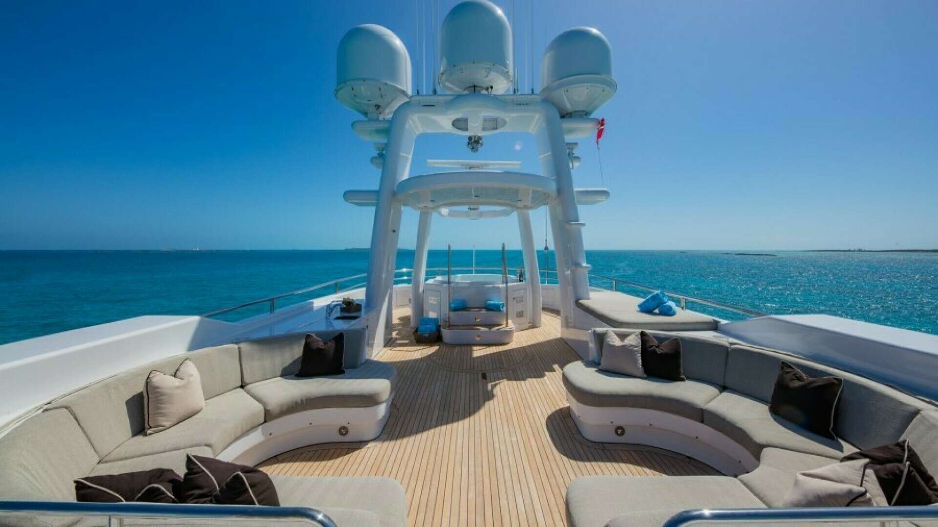 Centerline is a large square teak table with seating for 10. Aft of this table are chaise lounges, sofa, and small end tables. Aft of this is room for two jet skis and two 1,000 pound davits. Going up to the sundeck the Jacuzzi is centerline under the arch with seating forward. There is a sunpad starboard of the Jacuzzi and aft of this are large U-shaped seating to port and starboard. Aft of this is room for more jet skis, an inflatable tender and there is a 2,500 pound davit.
