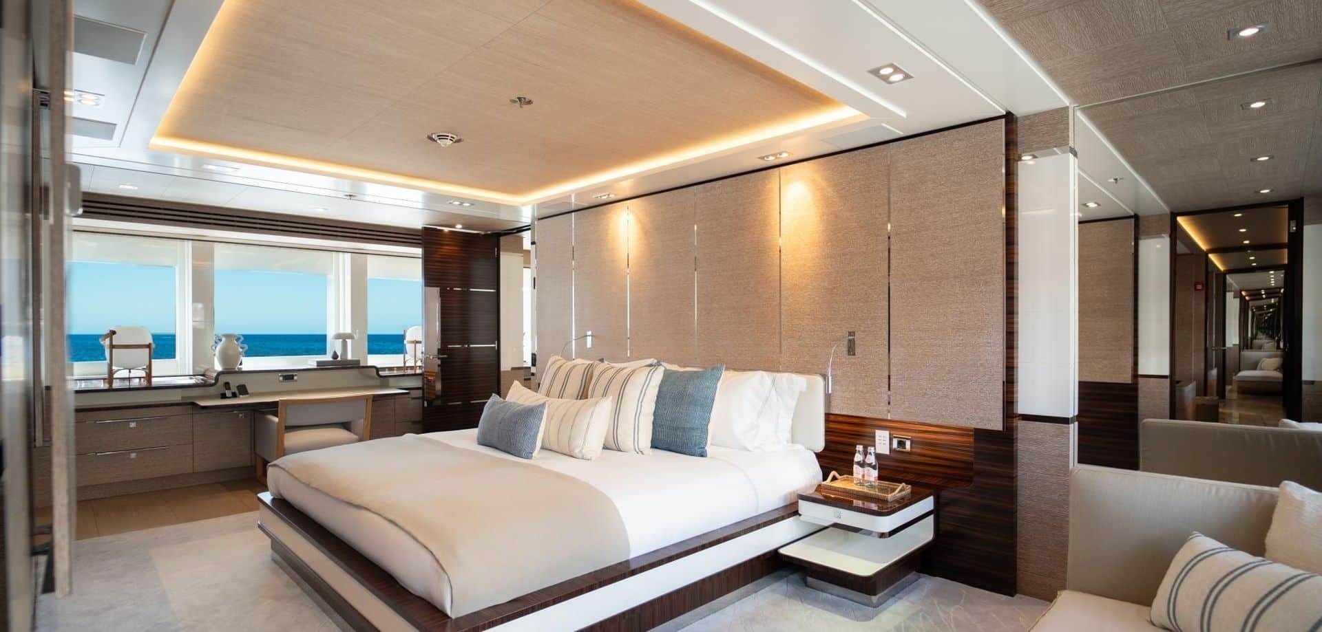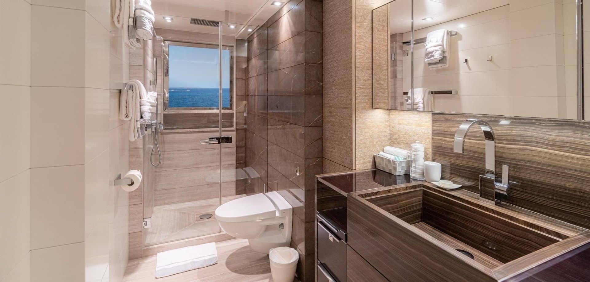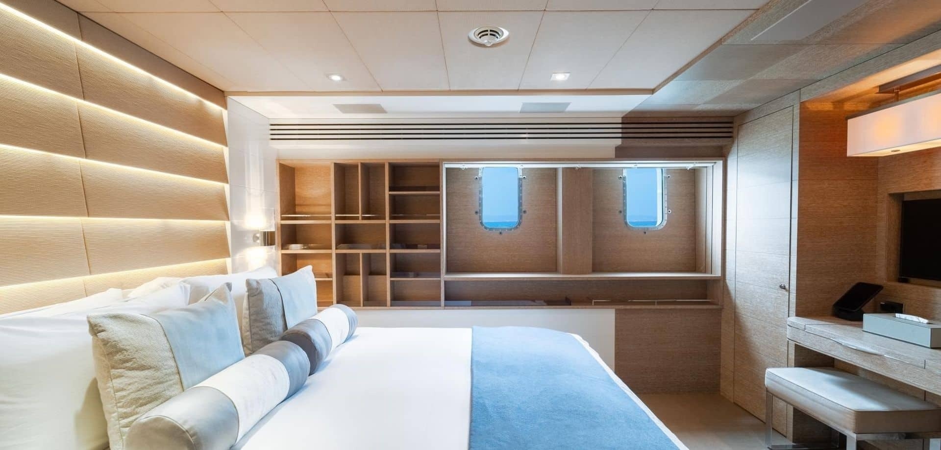 ASYA has accommodation for up to 12 guests across five beautifully appointed ensuite cabins. She includes a full-beam Owner’s suite with office which is conveniently located on the main deck forward, along with two doubles and two twin convertibles. She has further accommodation onboard for a crew of 10 which includes one twin Captain’s cabin and four bunk crew cabins.