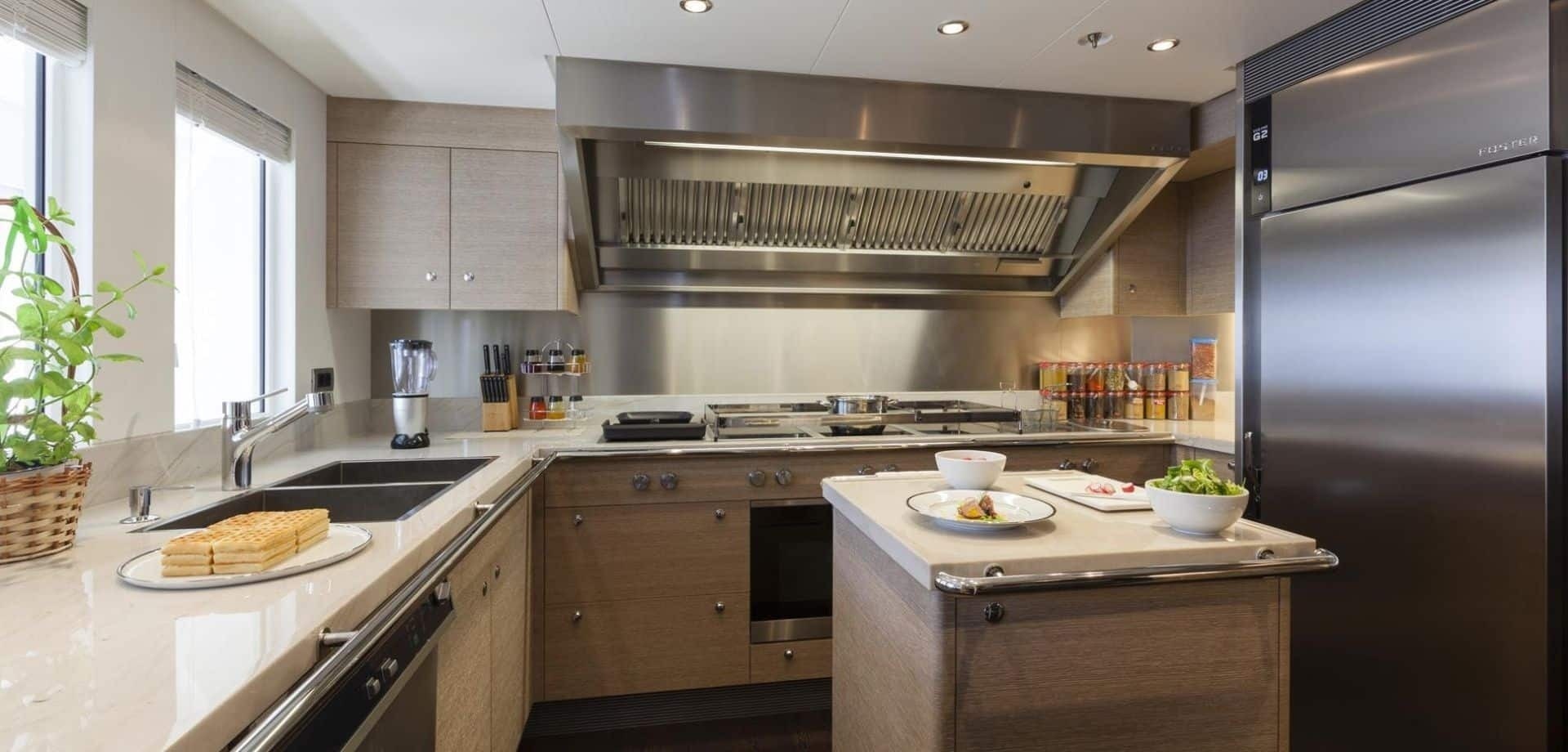 On the main deck, an in-built customised lounge setting can be found at her aft with expanses of deck for hosting guests. Doors flow into the open-plan main salon where there’s a lounge area, formal dining table, cinema and state of the art galley.
