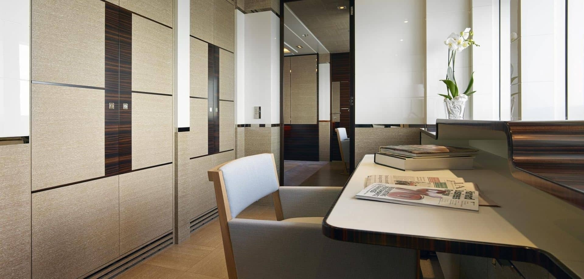 The sun deck is an entertainer’s dream, featuring a shaded area at the centre, protected by an awning which includes a bar, teppanyaki grill and lounge seating with a retractable awning. Forward, a jacuzzi with raised sun pads and additional sun loungers stepping down can be found.
