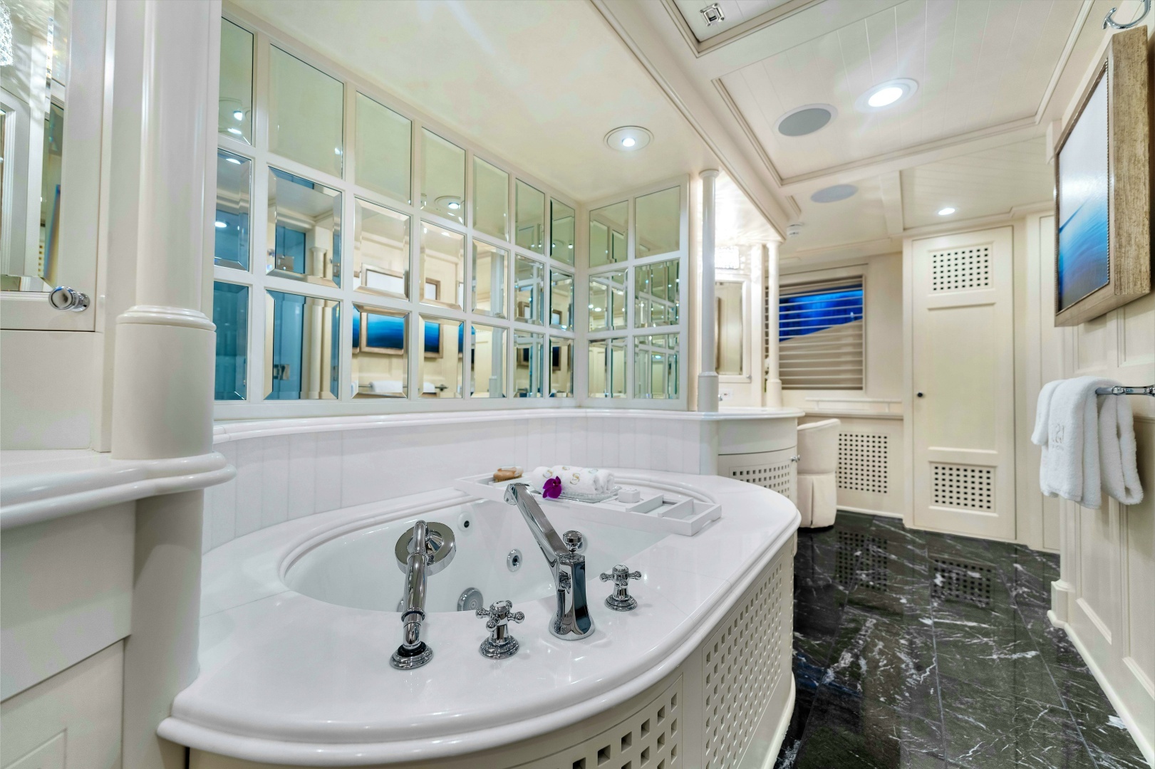 Accommodates 10 guests in five spacious cabins, including a Master suite with a king bed, two queen cabins, and two convertible cabins that can be arranged with either twin beds or a king bed in each room. The yacht also provides comfortable accommodations for 10 crew members across six cabins, including four double cabins, a Captain’s cabin, and an Engineer’s cabin. Each area of her stylishly appointed interior is finished in the finest woods, marbles and fabrics, creating a setting that is inviting, comfortable and elegant.