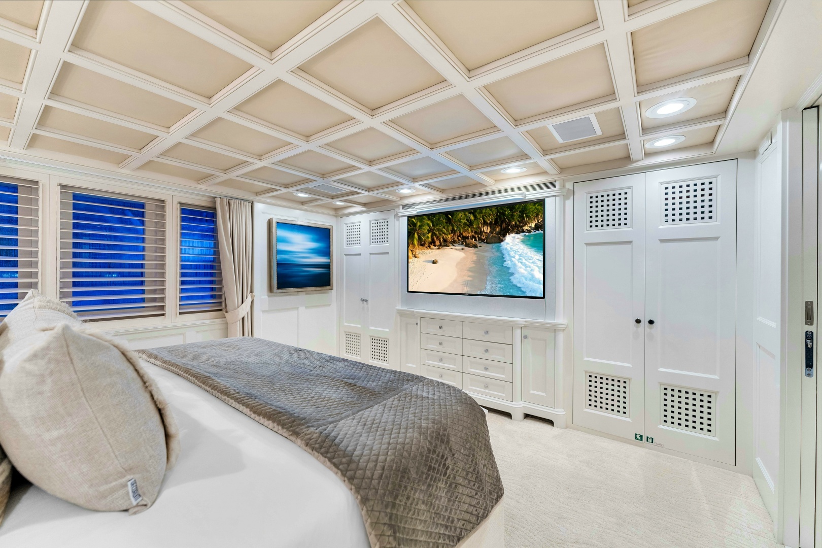 STAR DIAMOND accommodates 10 guests in ultimate comfort across five luxuriously appointed staterooms. The full-beam master stateroom on the main deck offers unparalleled privacy. The owner’s lounge, located on the starboard side, includes seating, an entertainment center, and a desk. The sleeping area on the port side features a plush king-size bed, and the master suite is completed with a luxurious en-suite bath, featuring both a shower and a Jacuzzi tub. The additional guest staterooms provide versatility, with two double-bed staterooms and two convertible twin beds, ensuring ample space for all.