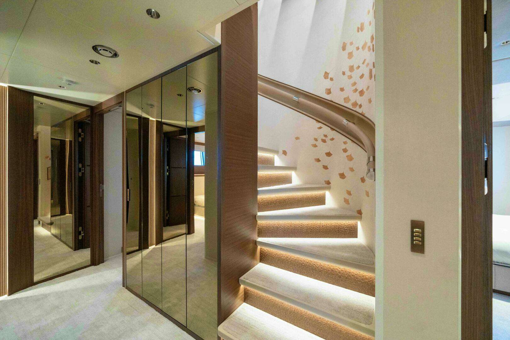 An elevator and central staircase connect the interior decks. Up to 9 crew are accommodated in 5 crew cabins, including a separate captain’s cabin. All crew cabins are located forward on the lower deck.