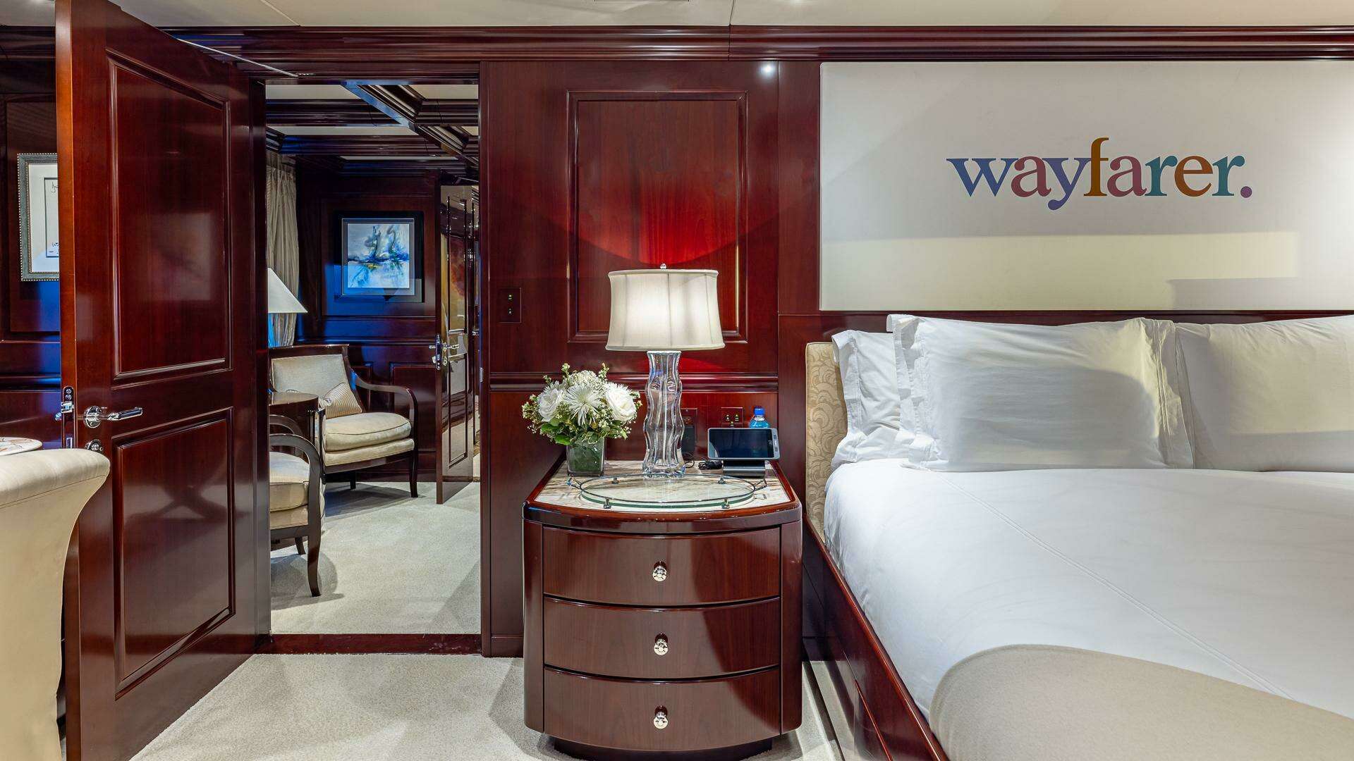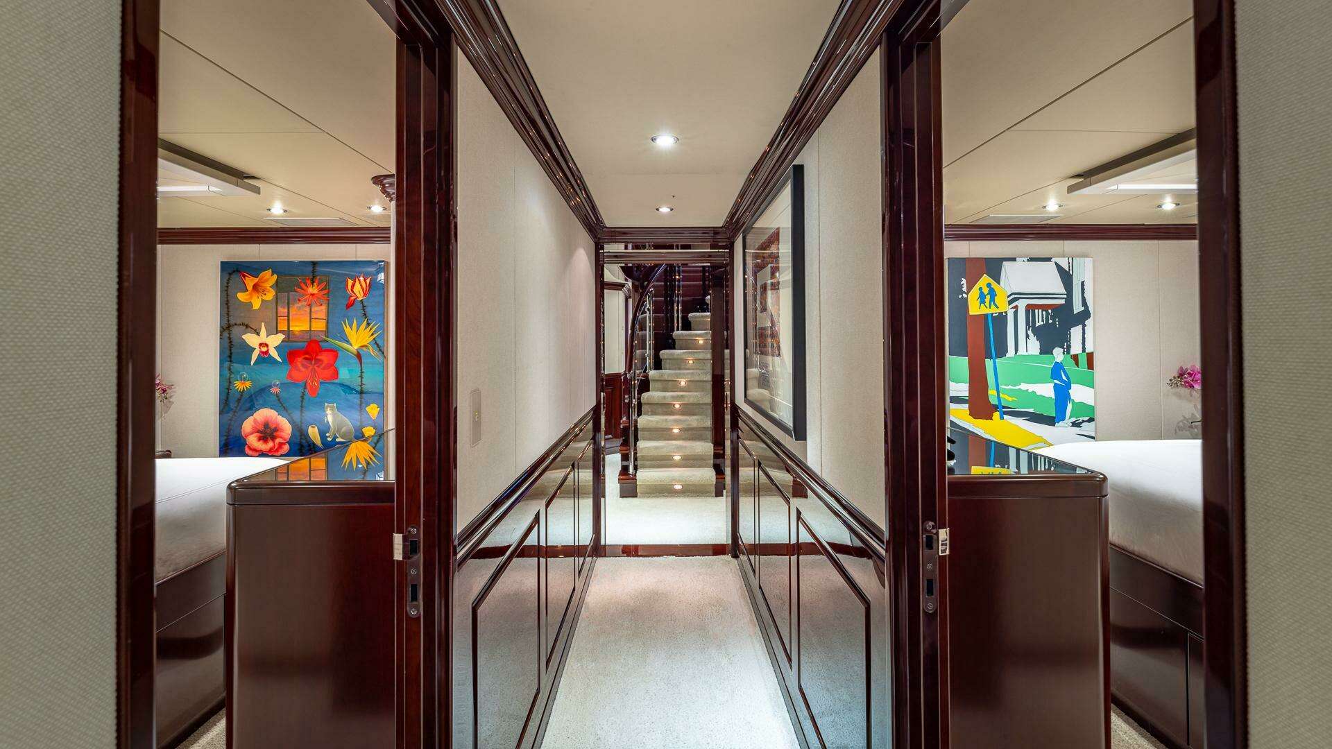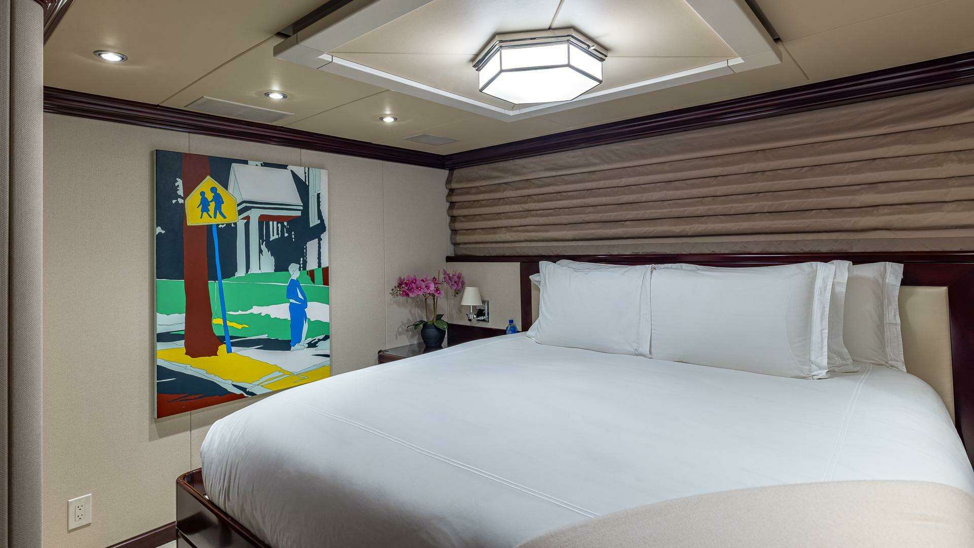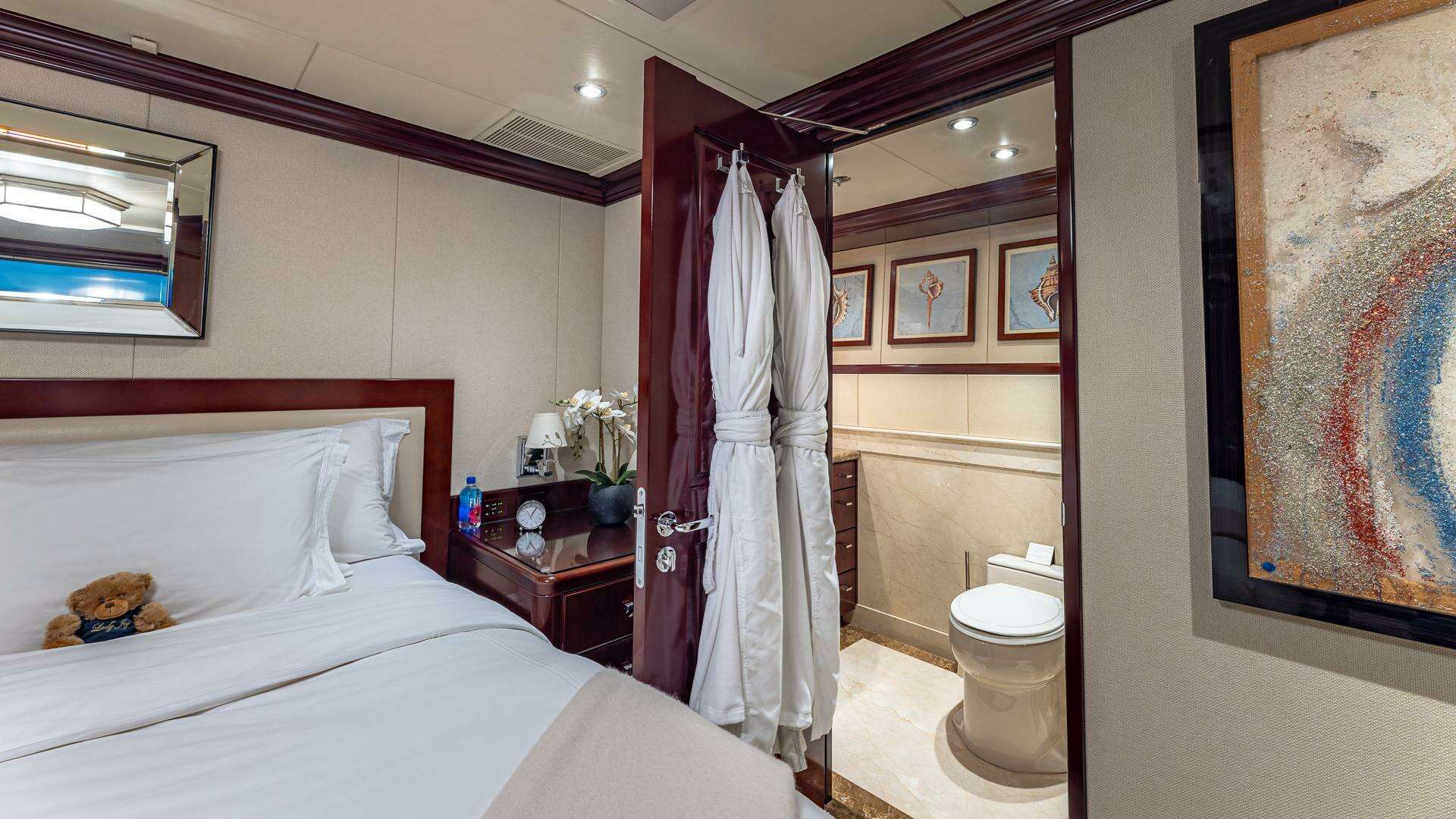 • Owner’s suite is located forward on the main deck. A king size bed facing forward leads through to a his/her ensuite with large spa hot tub and a central joining steam shower room. Ample closet space is located port and starboard of the ensuite bathrooms