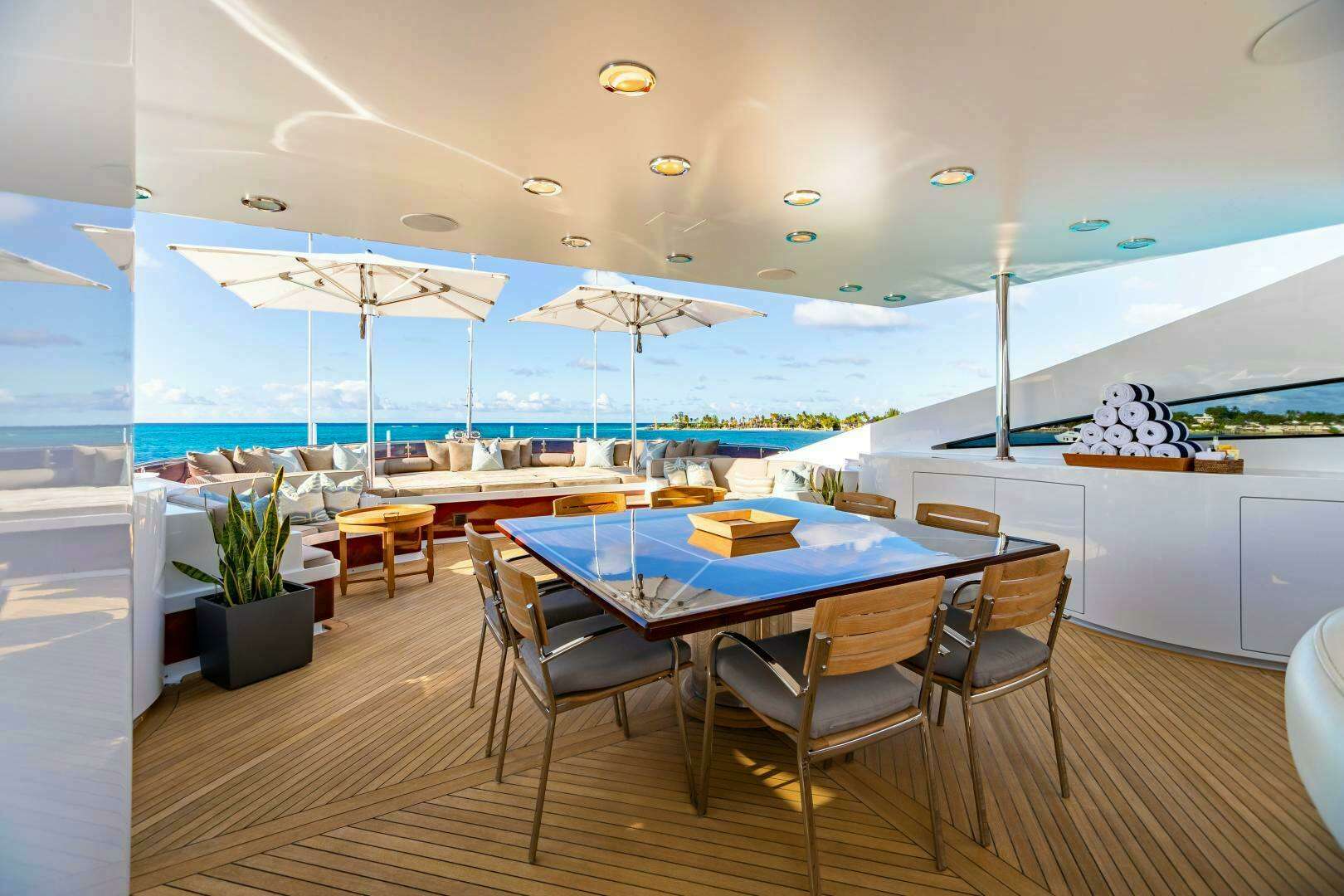 Sun deck features a custom, waterfall pool for 12 guests, dayhead, L-shaped bar, BBQ, large alfresco dining table, and plentiful sunpads and lounging areas.