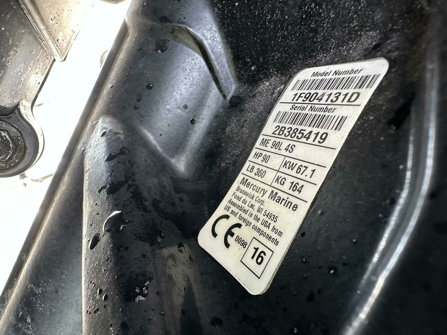 She comes powered with a Mercury 90hp 4stroke outboard engine, Garmin electronics/transducer, live well, navy blue canvas bimini, navy blue canvas helm cover/motor cover and full cover, waterski tow bar, fishing rod holders, original gel coat bottom, compass and more...