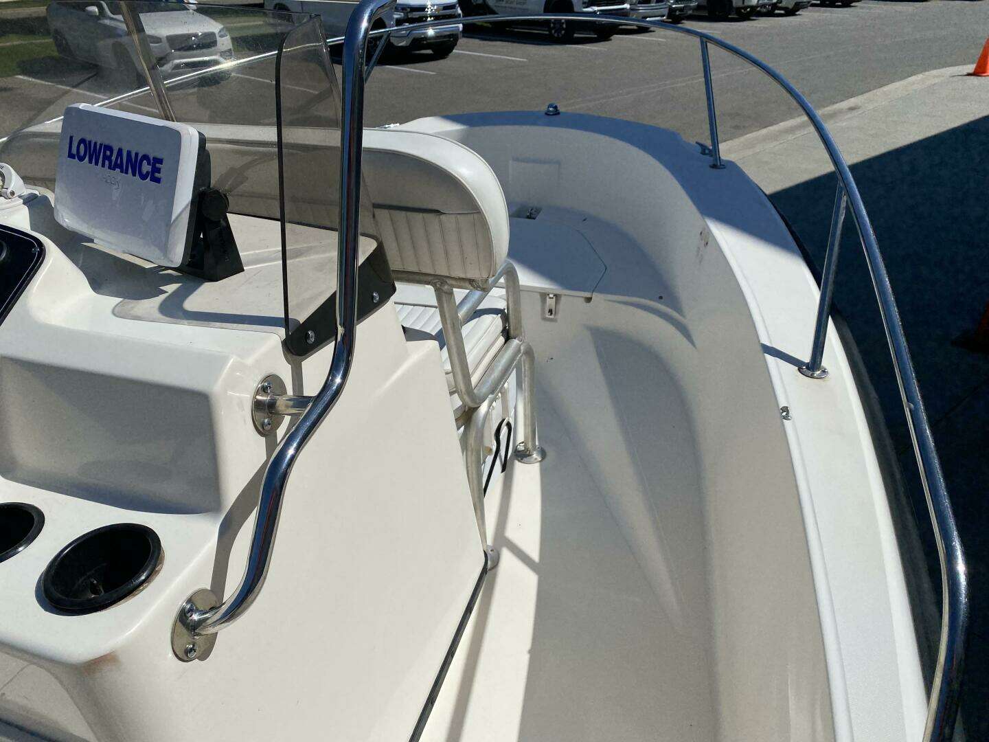 This 1998 Boston Whaler 18 Dauntless has been re-powered with a 2017 Evinrude 150 HP E-Tec engine. A freshwater, unsinkable, center console boat with comfort package and all the right options. Yacht quality components, Accutrack hull design for smooth, dry ride offering superior stability and predic