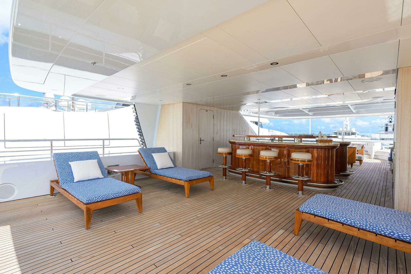 The skylounge provides a relaxed yet sophisticated retreat, finished with solid teak flooring, sycamore inlays, hand-woven teak ceiling panels, and figured sycamore wall finishes. A jewel-like bar area takes center stage, showcasing a backlit alabaster countertop and honey onyx bar fronts, complemented by a Pollaro-designed game table and bespoke saloon furniture.