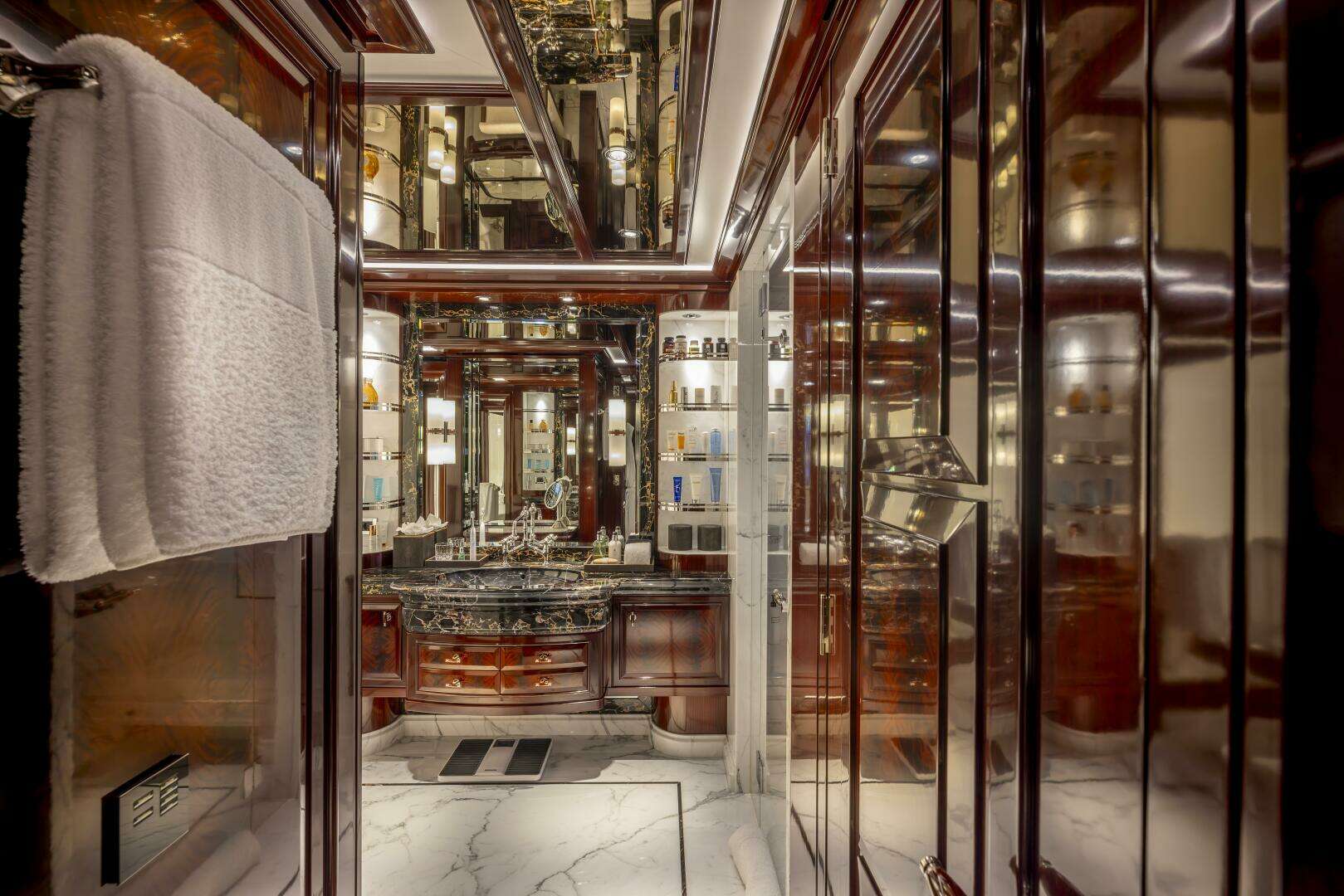 Guest staterooms mirror the Owner’s Suite in quality and finish, each featuring bespoke silk carpets, crotch mahogany wall panels, custom ceiling lights, and Frank Pollaro-designed (//pollaro.com/our-story/) desks and seating. En-suite bathrooms are fitted with Saint Laurent marble vanity tops, each carved from a single block with integrated sinks.