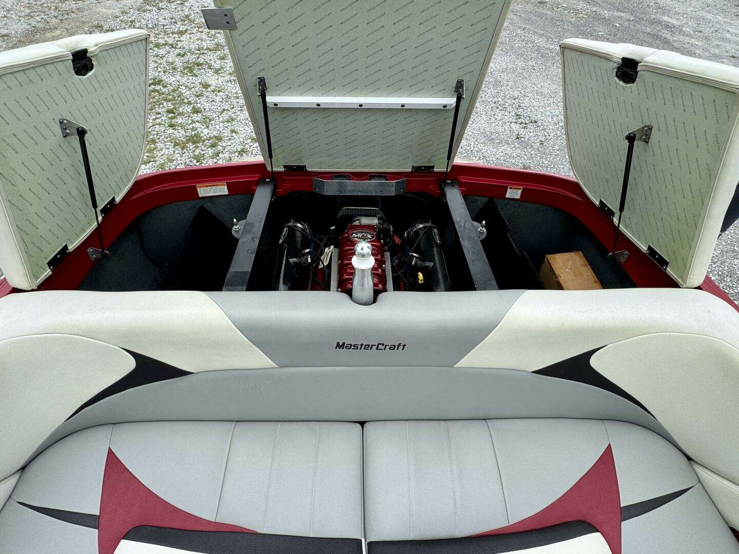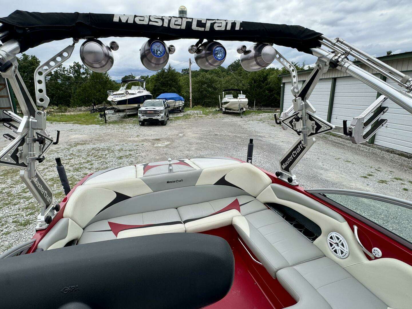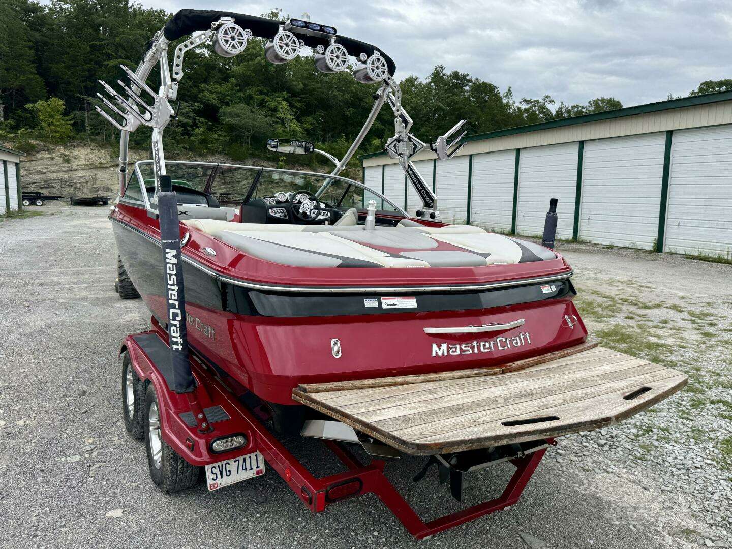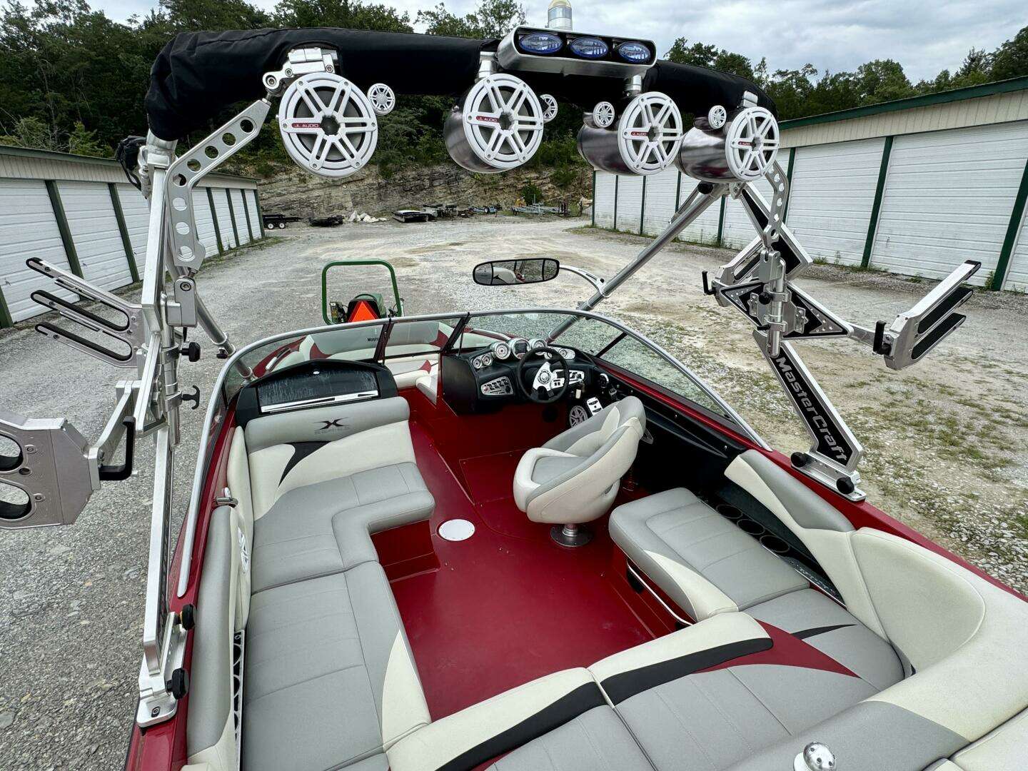 This One-Owner, Fresh Water, 2008 MasterCraft X-2 Wake Board & Wake Surf Boat For Sale near Norris Lake Tennessee is equipped with a 5.7L MCX Indmar Vortec 350 HO MPI ETXCat V-drive inboard engine and features MasterCraft's pickle-fork bow with a Zero-flex wakeboard tower w/dual swivel clamping ski/board racks, a rear-view mirror, bimini top, tower lights, docking lights, under-water lights, Gen2 surf tabs with the attitude adjustment plate and factory ballast tanks, a 3-outlet cockpit heater with heated driver and observer seats, PerfectPass wakeboard pro cruise control with an integrated depth finder, air/water temperature displays, ballast, and tab status displays, a Clarion AM/FM/CD/Aux Input stereo with (2)JL Audio amplifiers, a JL Audio subwoofer, (8)JL Audio speaker/tweeters throughout (4-cockpit/4-tower), a removable igloo cooler w/dedicated under-seat storage, snap-in cockpit carpeting (not shown), a mooring cover, integrated bow wind-block, dual batteries with a battery switch, a matching tandem axle trailer with brakes, a spare tire, and a swing tongue is included and much more!