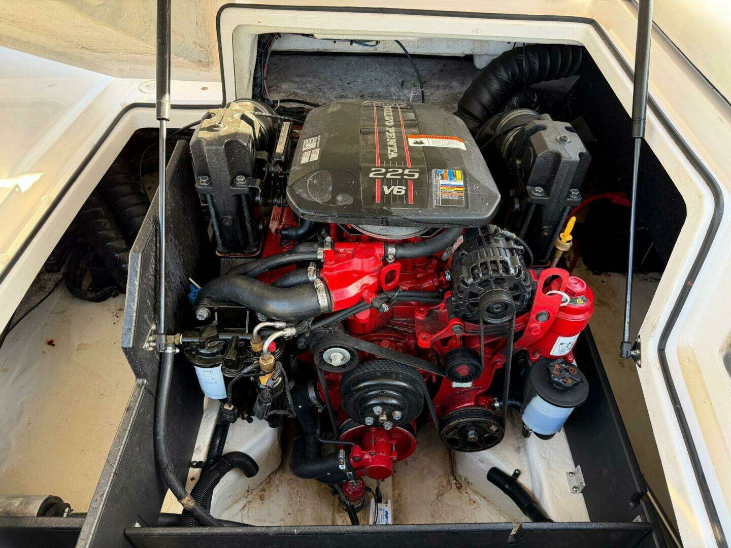 She's a one-owner vessel and is offered with a Volvo Penta 225 hp IO, Bimini top, bow well and cockpit cover, bow walk-through doors, cockpit carpet in sea grass, cockpit table, bow docking lights, electric folding sport tower, stereo performance pkg., and a premier gel finish to the hull.