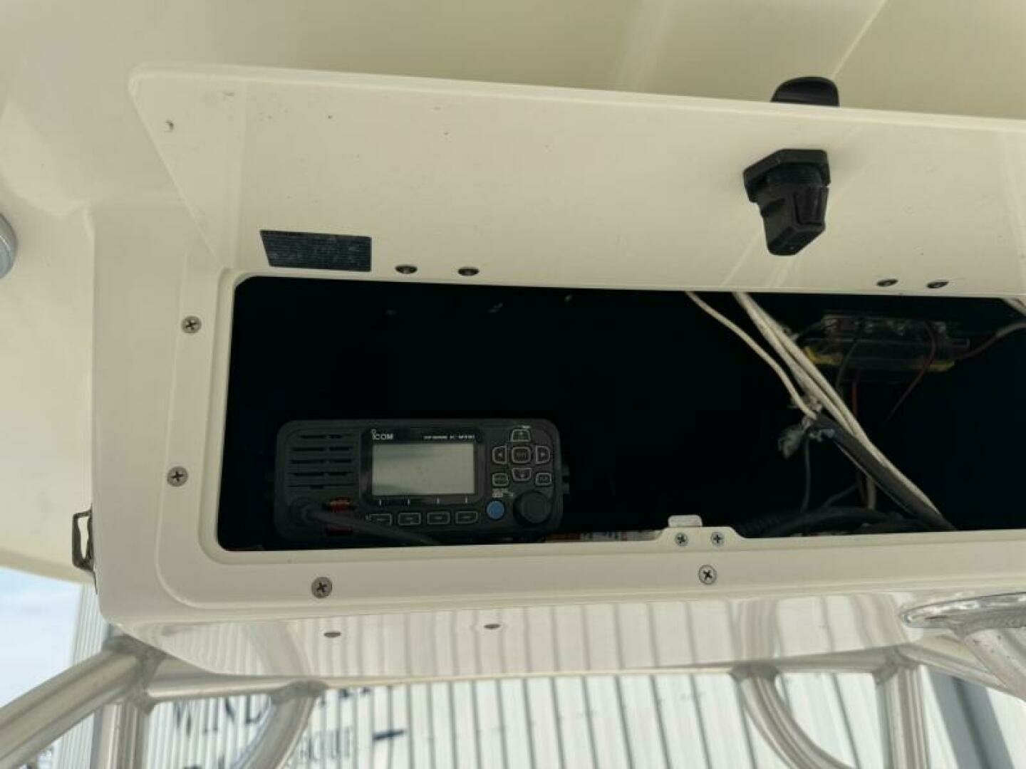 Icom VHF marine radio mounted in T-top electronics box