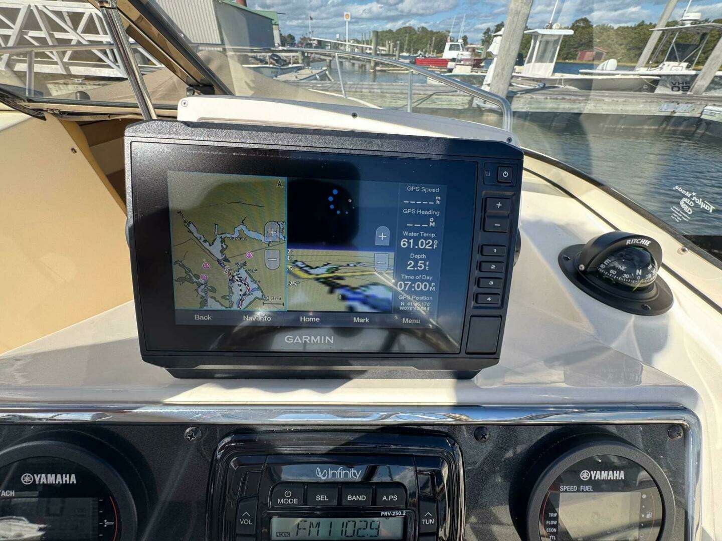 Features include a Platinum Gray Hull, Garmin GPS/SONAR, Ritchie Compass, Hydraulic Steering with Tilt Helm, Yamaha Digital Gauges, Live Well, Wash Down, Bow Table, Stainless Steel Framed Glass Windshield, Bimini Top, Bow & Cockpit Covers, and more.