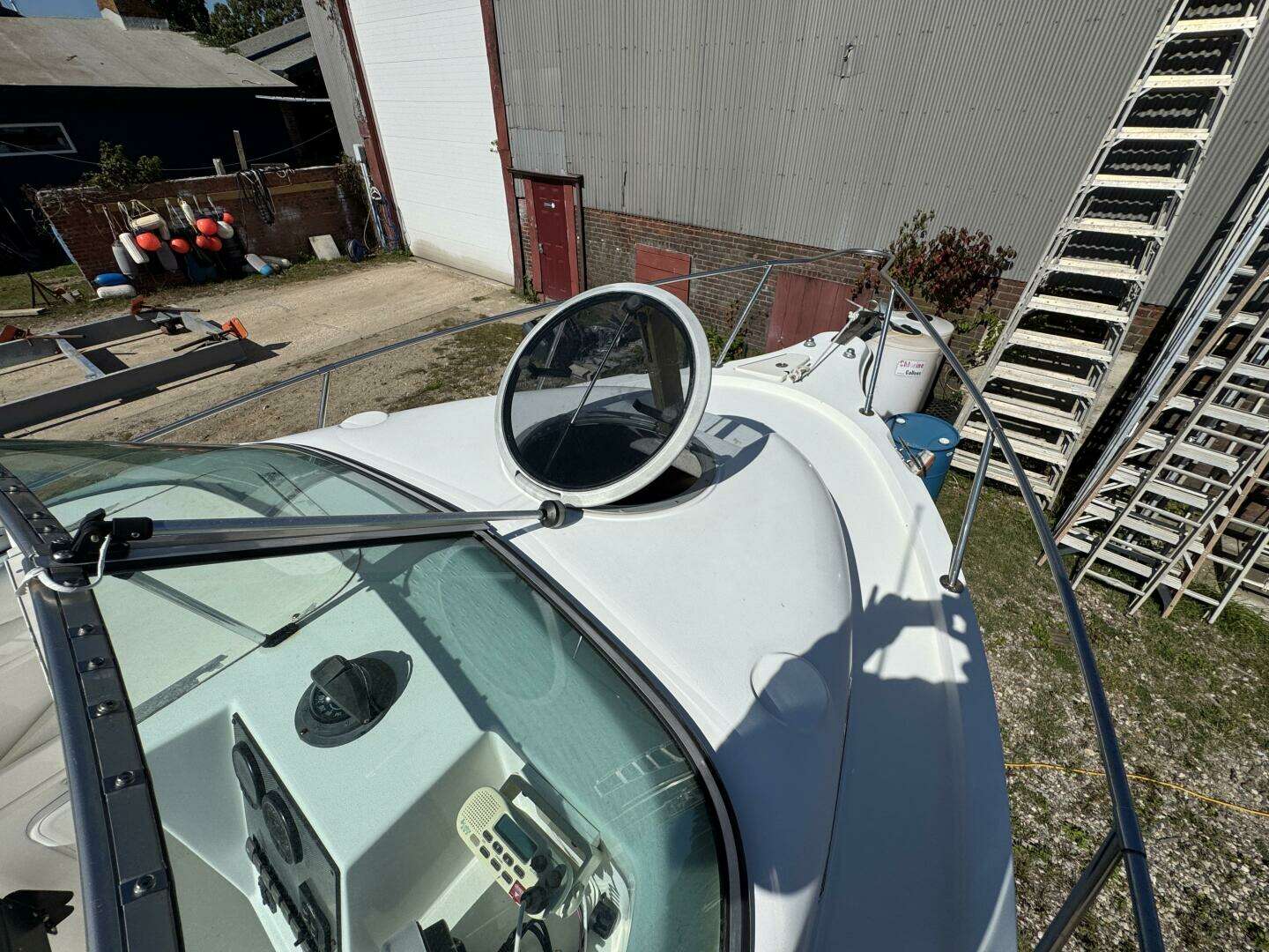 - Trim tabs, swim ladder, bimini top, and full canvas enclosure