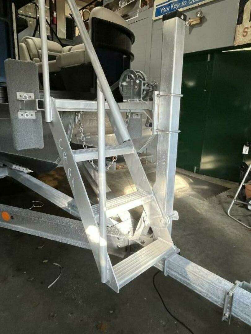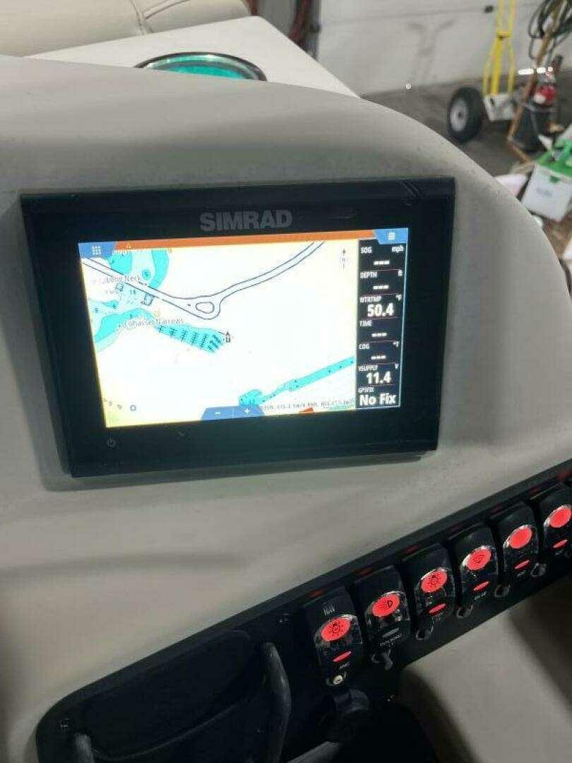 Equipped with Bluetooth stereo, Simrad GPS/SONAR, electric Bimini top, boarding ladders, and a custom Magic Tilt aluminum I-beam trailer with slide-off bunks, load guides, and forward boarding stairs. Always serviced by a Mercury Platinum Dealer with all services fully up to date.