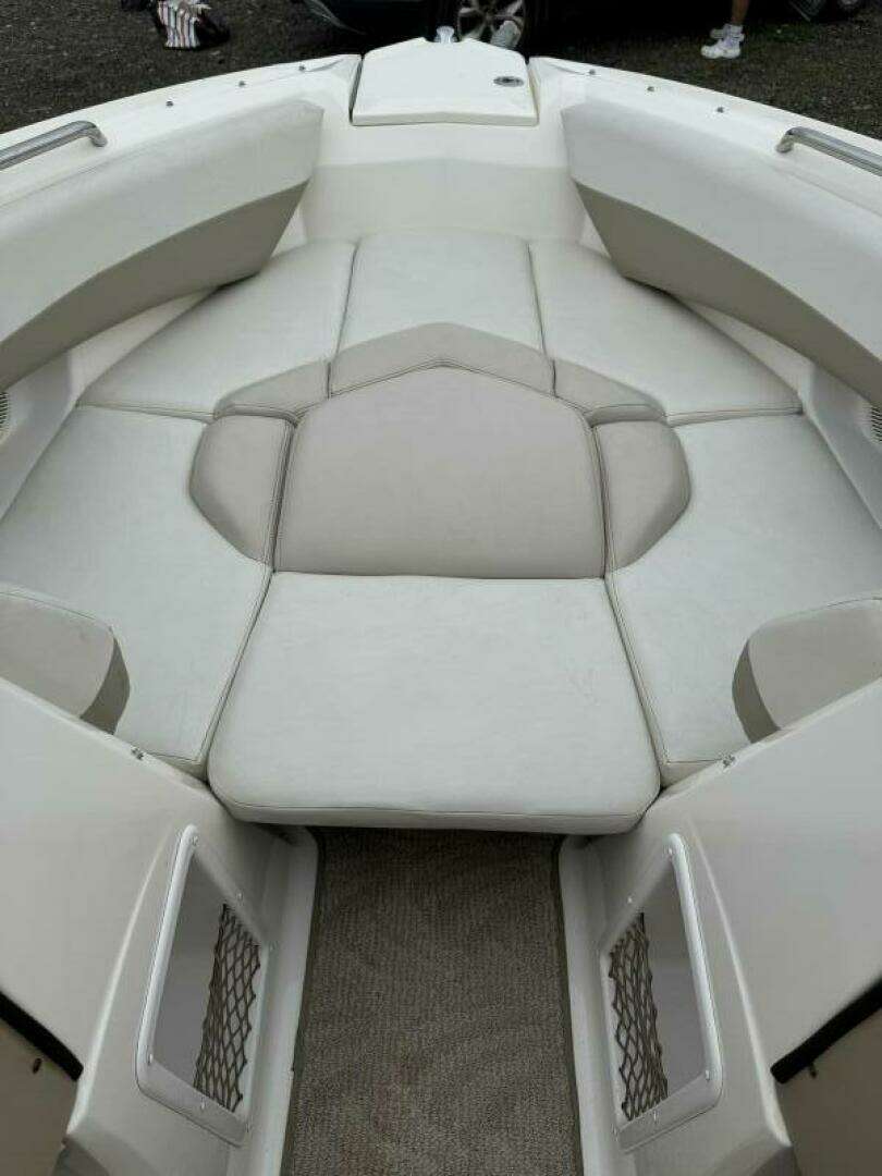 - Cockpit & Bow Layout: Spacious U-shaped bow seating with cushioned loungers, convertible to a sunpad. Roomy cockpit benches for 8+ adults, plus flip-up bolster seats for the helm.