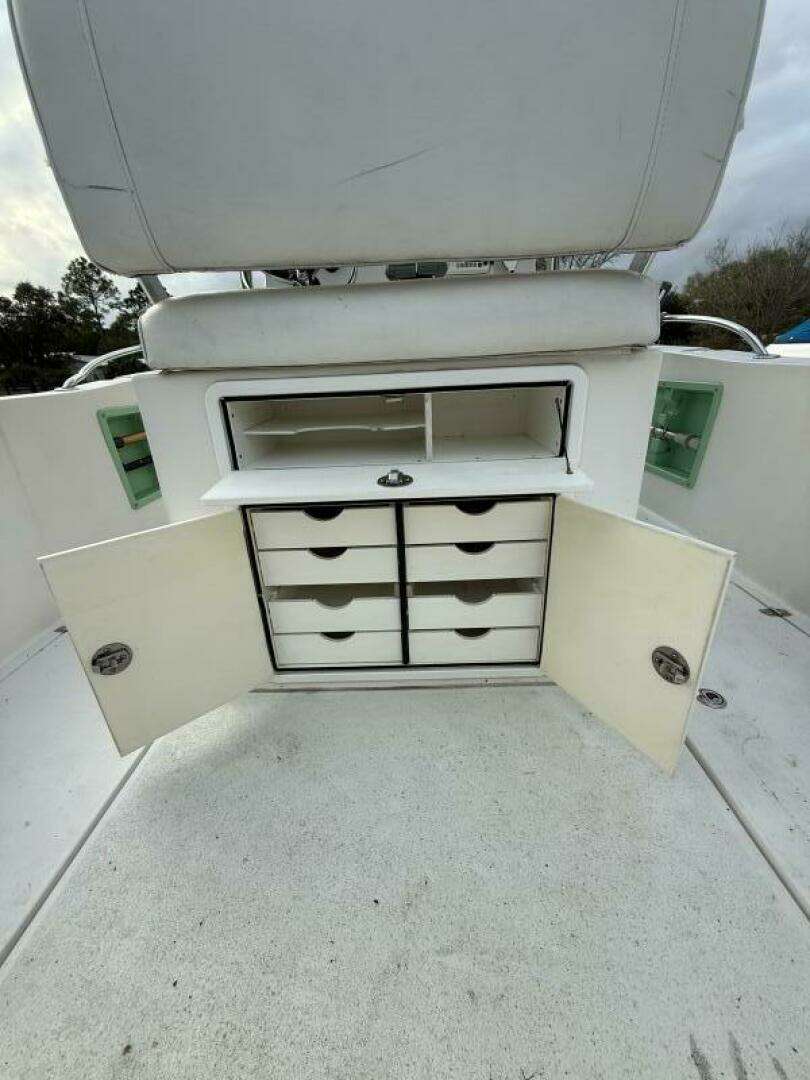 Up front, the large forward casting deck offers generous storage and is equipped with a Rhodan trolling motor, allowing you to stay locked on the fish with precision and control. At the helm, you’ll find Suzuki controls and gauges, a Garmin chartplotter, and a West Marine VHF, all powered by twin Suzuki 140 outboards for reliable performance and efficiency.