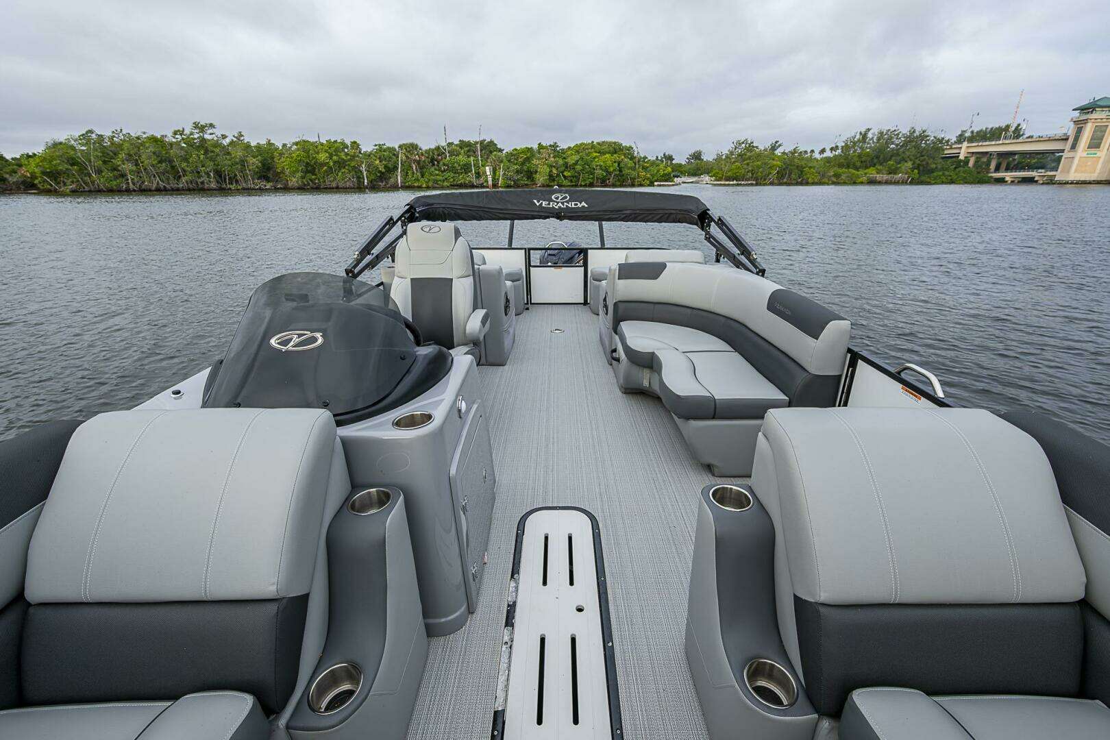 This Veranda 22 RFL Tri-Toon is fully loaded and ready to go. Lightly used, maintained, lift kept, and turn key. Upholstery in great condition. Boat comes with double axle trailer that has only been in the water a couple times. While on a boat lift, the boat was always kept under a full cover. Upgraded engine package with a Yamaha 250SHO (78 hours) with transferrable warranty, speeds of over 40mph are no problem. Tons of seating and plenty of storage!