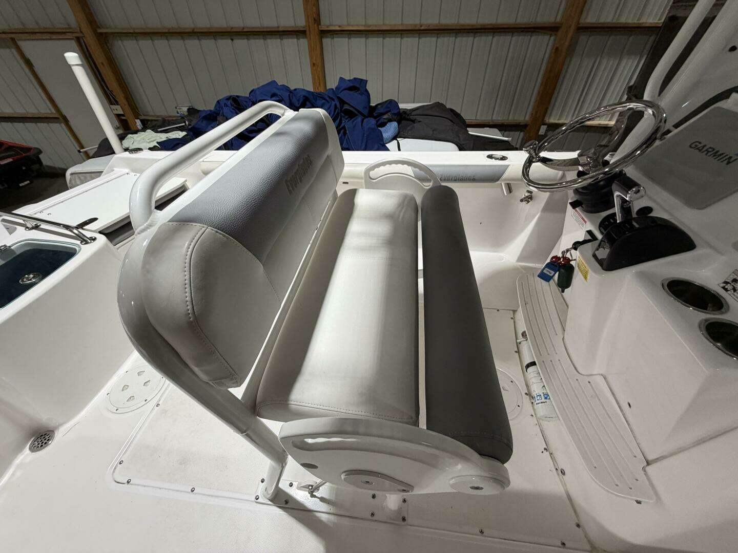 - Adjustable bolster helm seat with integrated cooler slot.