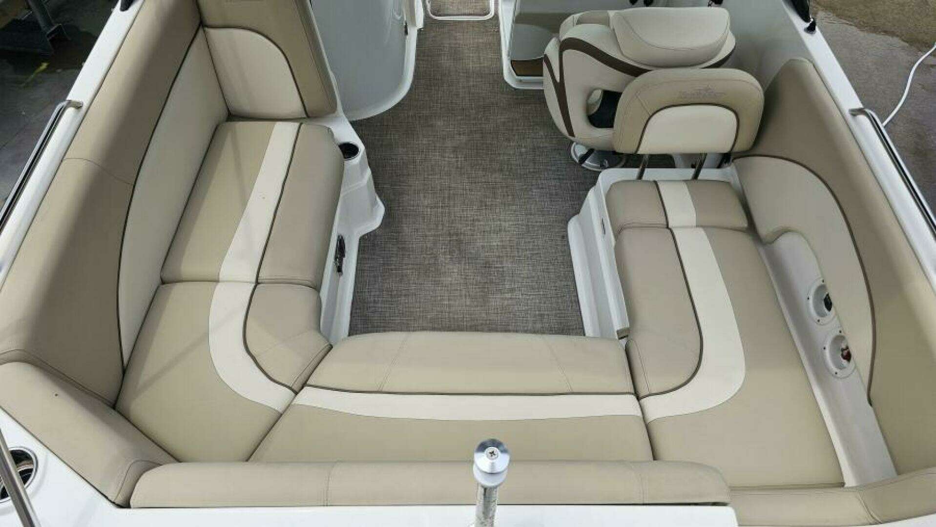 Its rugged Deep-Vee hull and U-shaped wraparound cockpit ensure a comfortable ride for everyone. A panoramic walk-through windshield, enclosed dressing room, leather touch upholstery and Fusion® stereo system are just a few of its creature comforts. A Seadek transom landing and forward and aft boarding ladders extend the fun beyond the boat. Take it up a notch with the optional fishing package, which includes a live bait well and fishing seat. Now we are talking.
