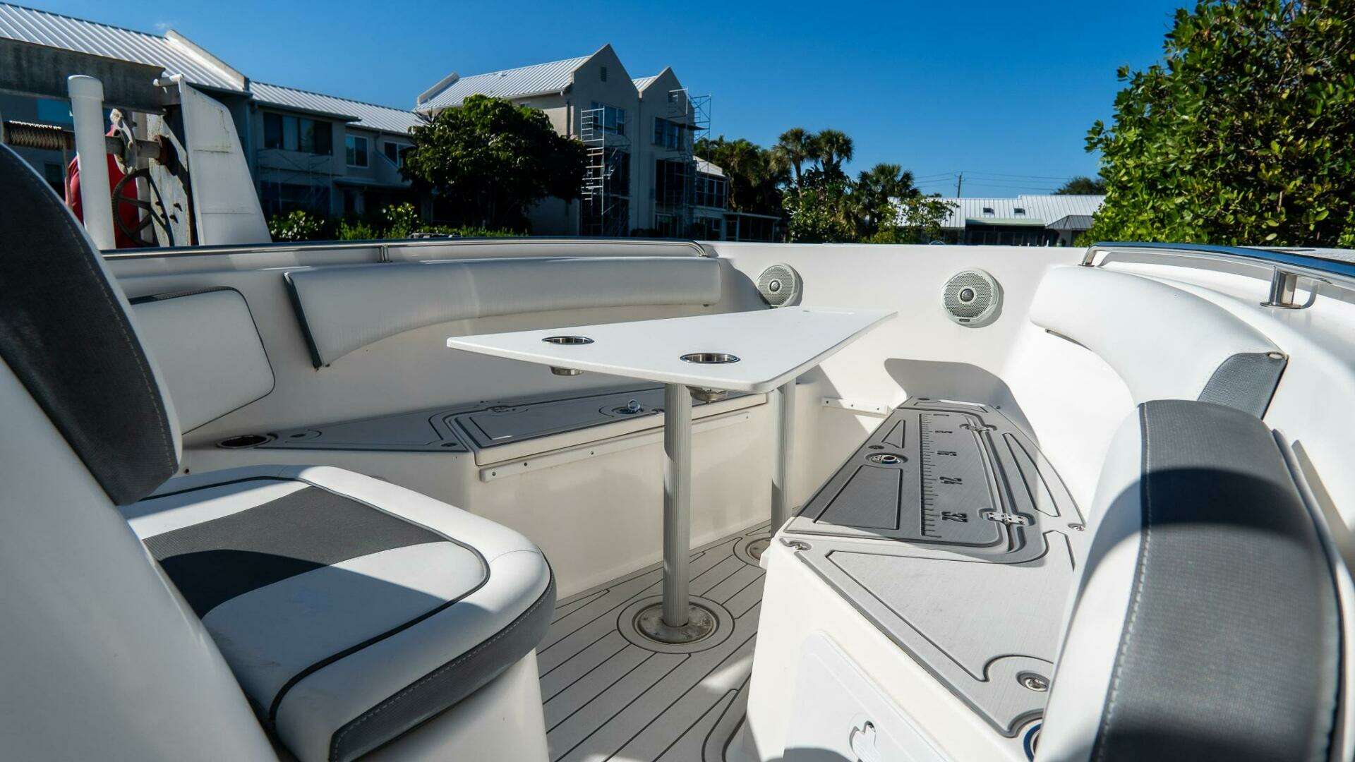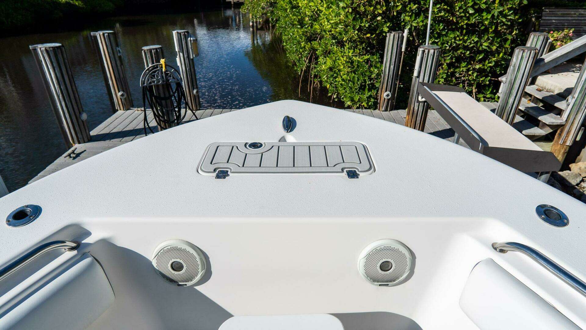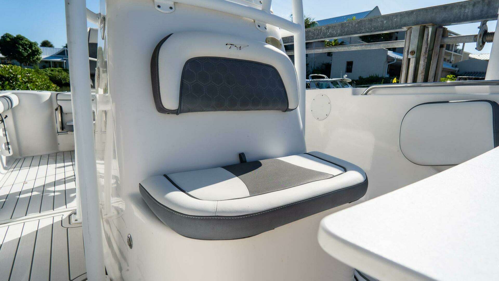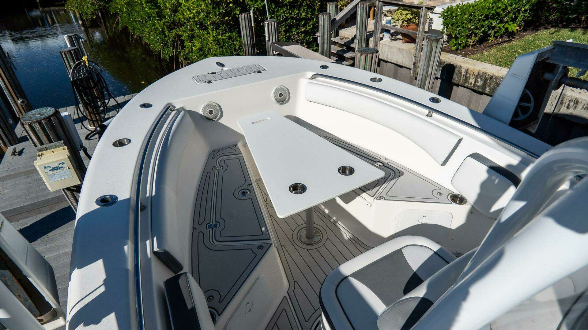This boat is equipped with the features serious anglers and weekend cruisers appreciate, including a Garmin 10" GPS, ICOM VHF, SeaDek flooring package, and a Polk sound system. A custom bow table with filler cushion adds versatility for lounging, entertaining, or converting the bow into a casting platform. Trim tabs provide added control in varying sea conditions, enhancing performance and comfort.