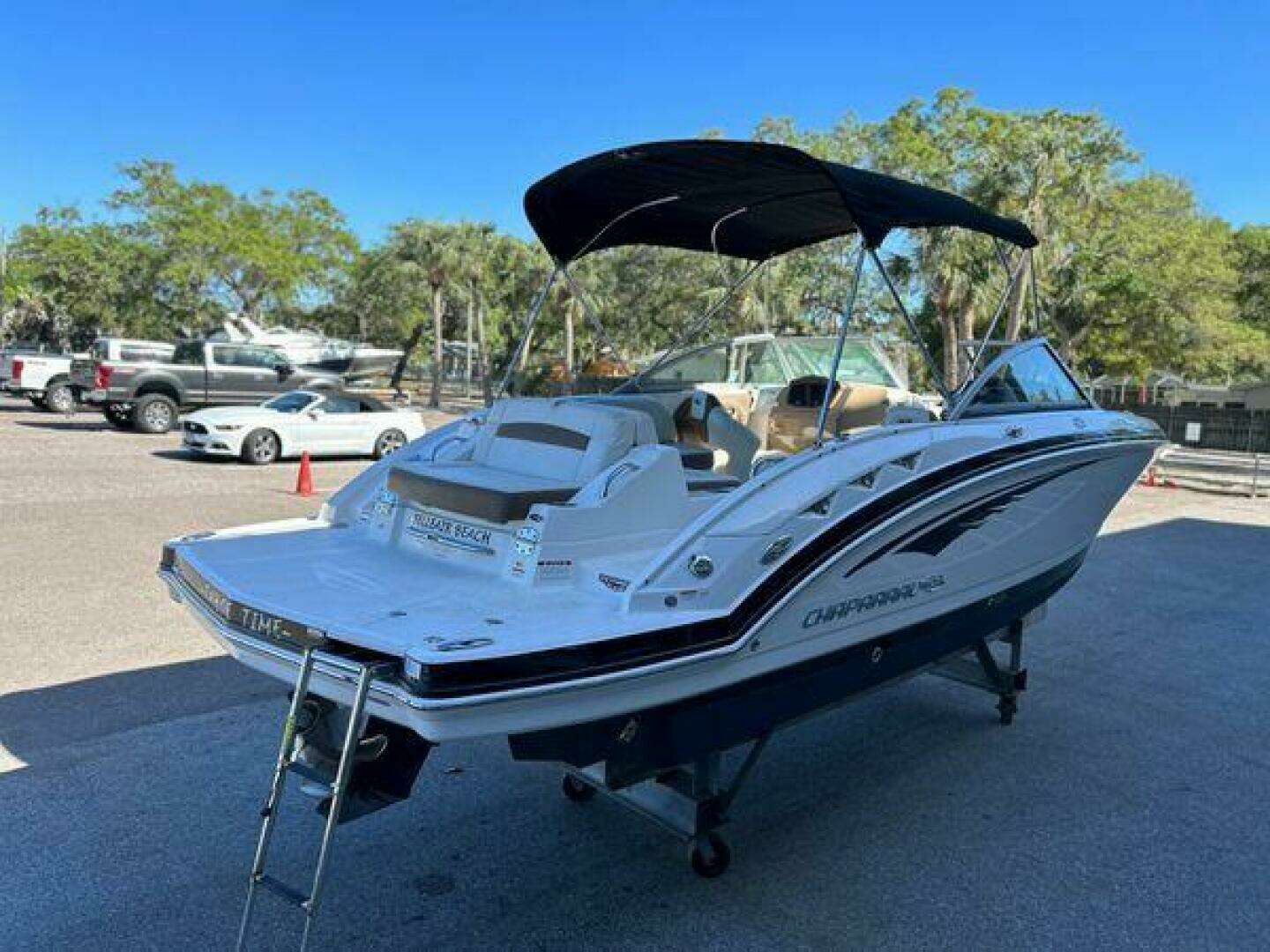 Comfort and convenience features include a pump-out head, pressure water system, snap-in carpet, premium sound system, cockpit and bow covers, dual battery switch, and battery on/off switch. A Bimini top provides shade, while both the swim platform with boarding ladder and bow boarding ladder make water access easy and practical.