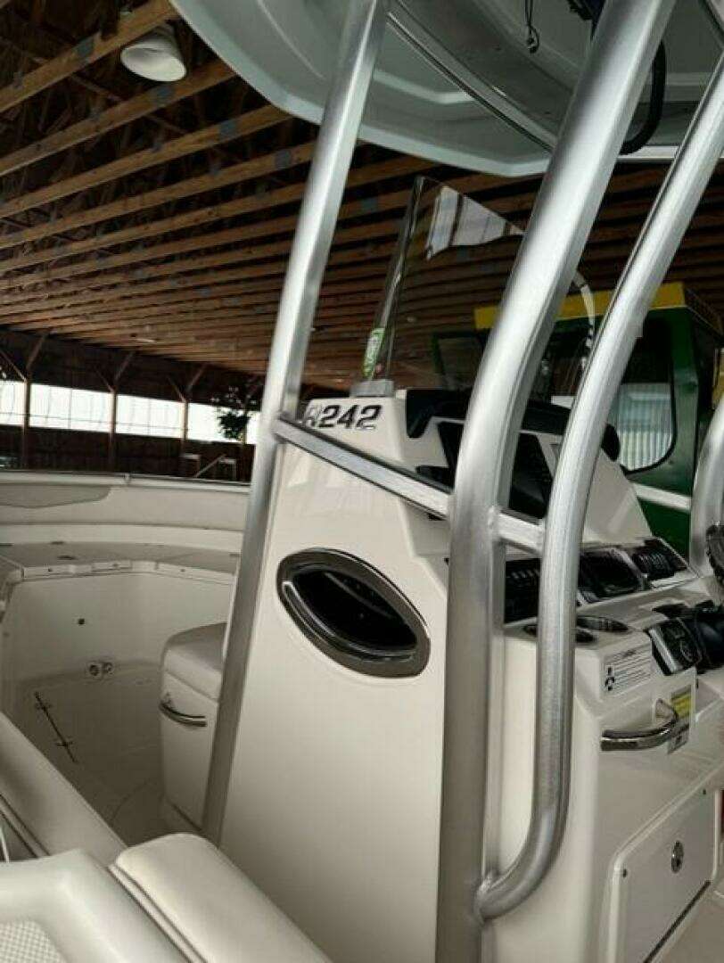 Brace yourself, fish boat design just took another giant leap forward. Upfront, the large casting platform is sure-footed and accessible. In the cockpit, a forward entry privacy head comes standard with a porta-pottie and a screened opening port light. Little extras like LED cockpit lighting, a bow filler cushion and a freshwater cockpit shower are all standard. Serious anglers will appreciate the best-in-class livewell capacity and massive insulated fish box storage. At this length, nobody does it bigger or better. Fully equipped standard, take the R242 up a notch with key options including a fiberglass T-top that comes complete with four rod holders, LED spreader lights and an electronics box.