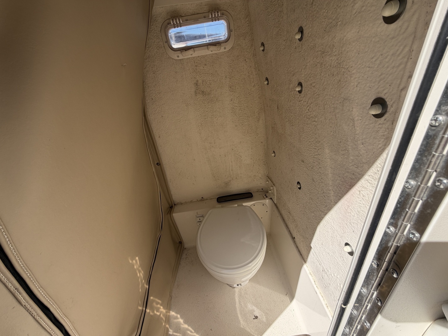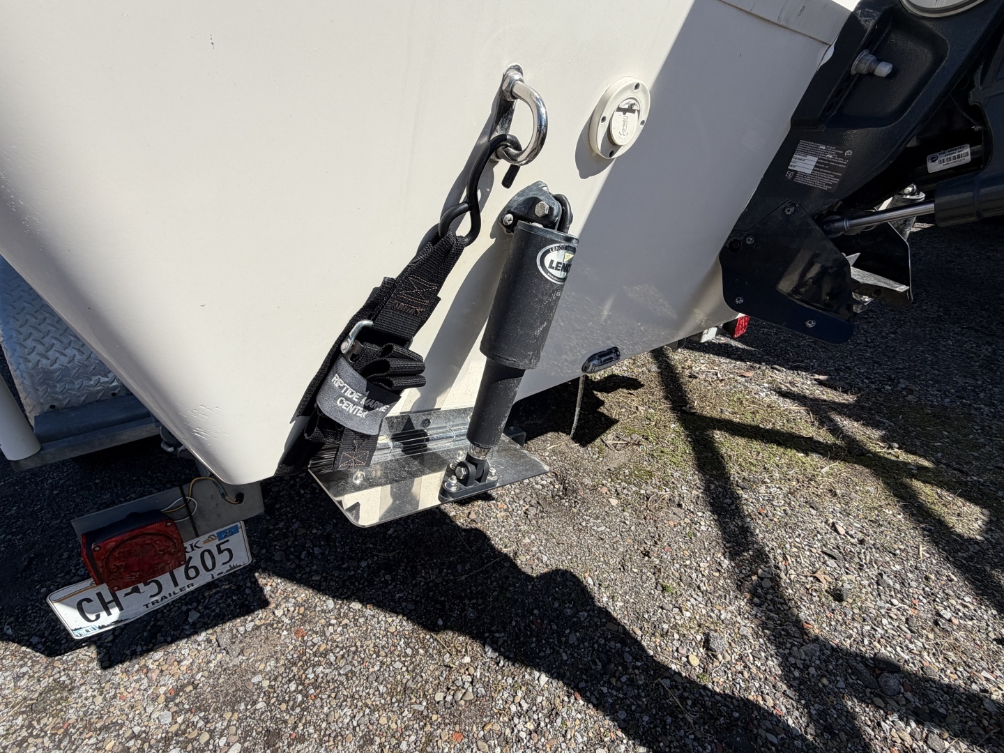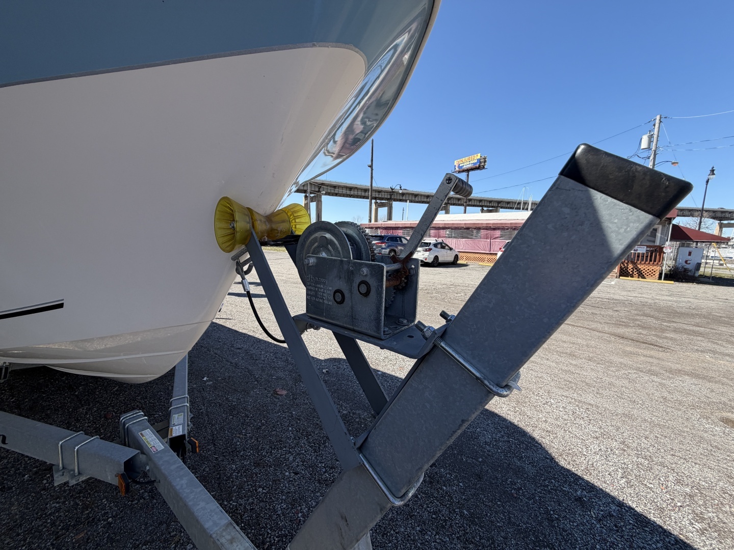 This 2017 Sea Chaser 24 HFC offers a perfect blend of performance and comfort. Its white hull with an evening-sky blue stripe makes a statement. Equipped with a 300-horsepower Evinrude with only 191 hours, it features abundant rocket launcher rod holders for fishing enthusiasts. A full private head ensures comfort for extended trips, while a windlass makes anchoring easy. The side door offers convenient boarding, and underwater lighting adds a touch of ambiance for night excursions. With ample rear storage compartments, a freshwater tank, a stereo system, and a trailer included, this boat is fully equipped and ready for adventure.
