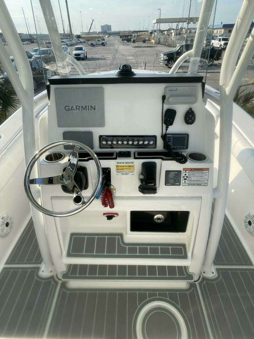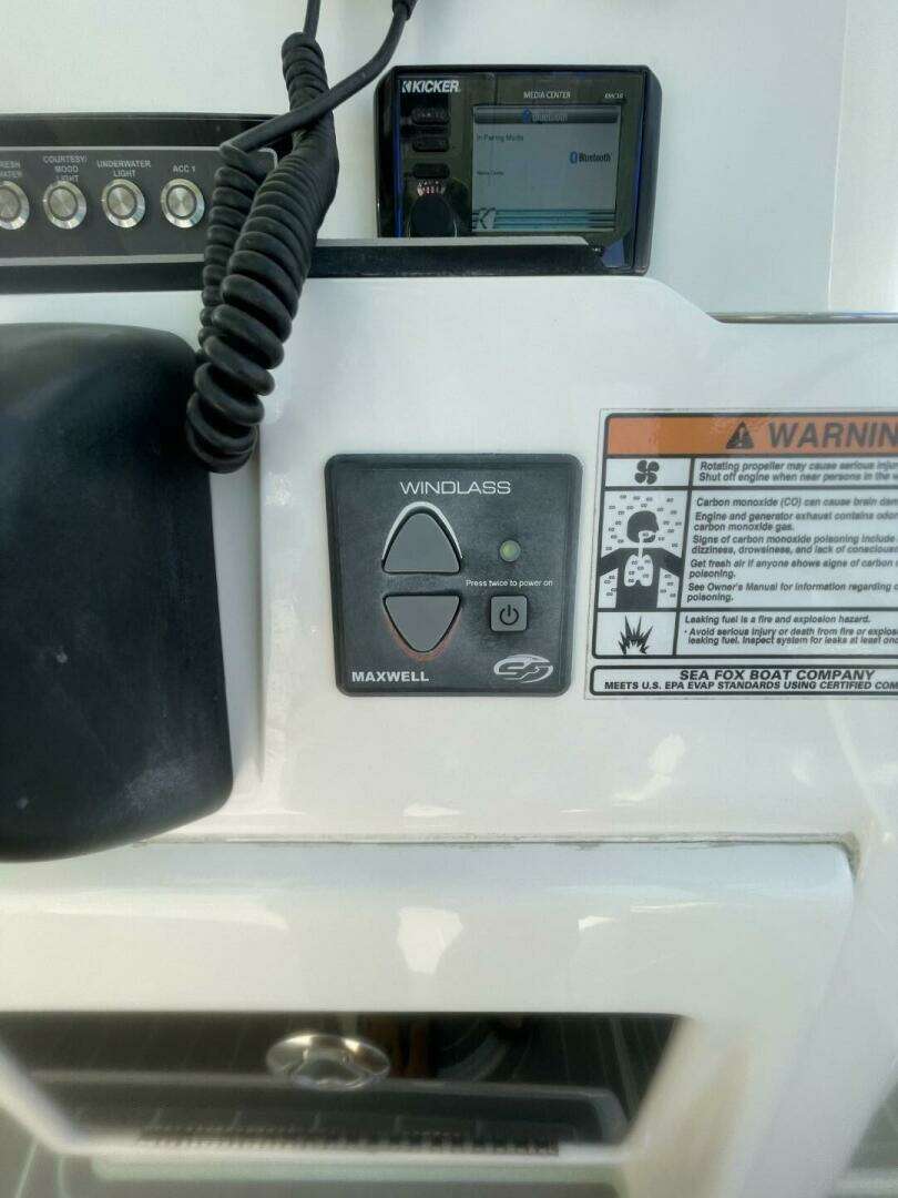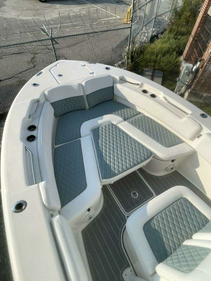 The Sea Fox 248 Commander has a forward seating arrangement with removable soft goods, table insert, and fold-away back rest. Equipped with a Maxwell Electric Windlass, grab railing, cup holders, in-deck storage locker, and center console forward seat. The center console is large in size with great storage capacity, hard top covered with more storage lockers, comfortable leaning post with fold-up seats, and Yeti Cooler. The stern has a livewell to port, 3/4 length seating with back rest combining storage locker, tow bar centered, Minn Kota power pole to port and swim ladder to starboard. Bolster cushions from stern to bow and ghost grey sea deck throughout.