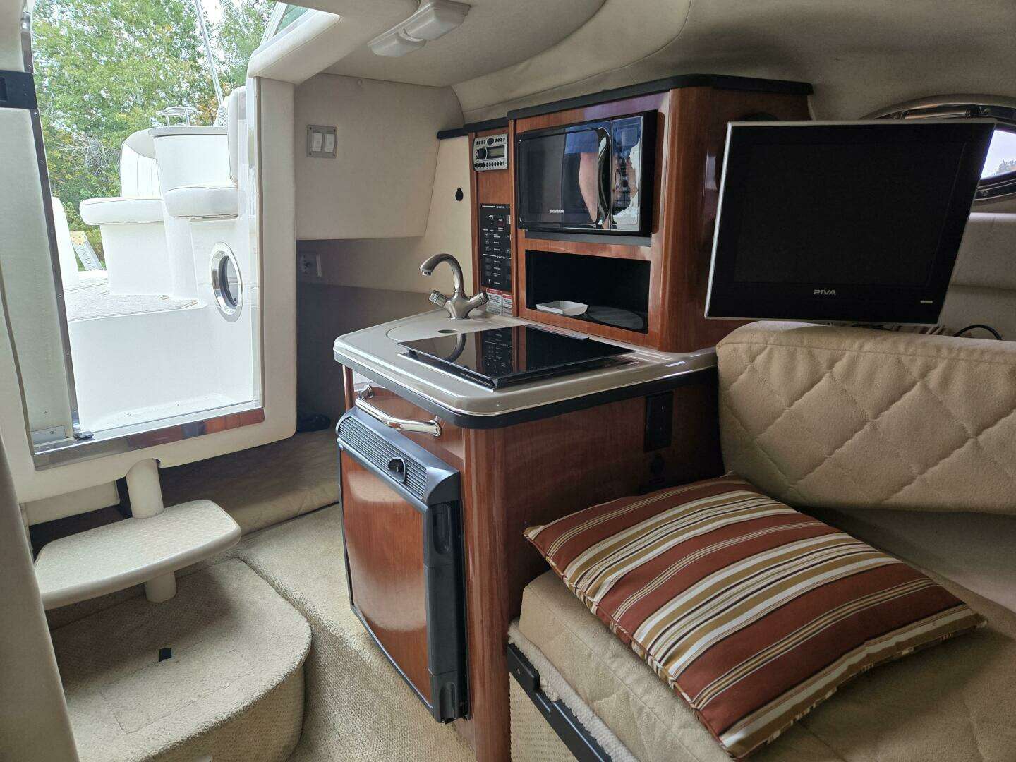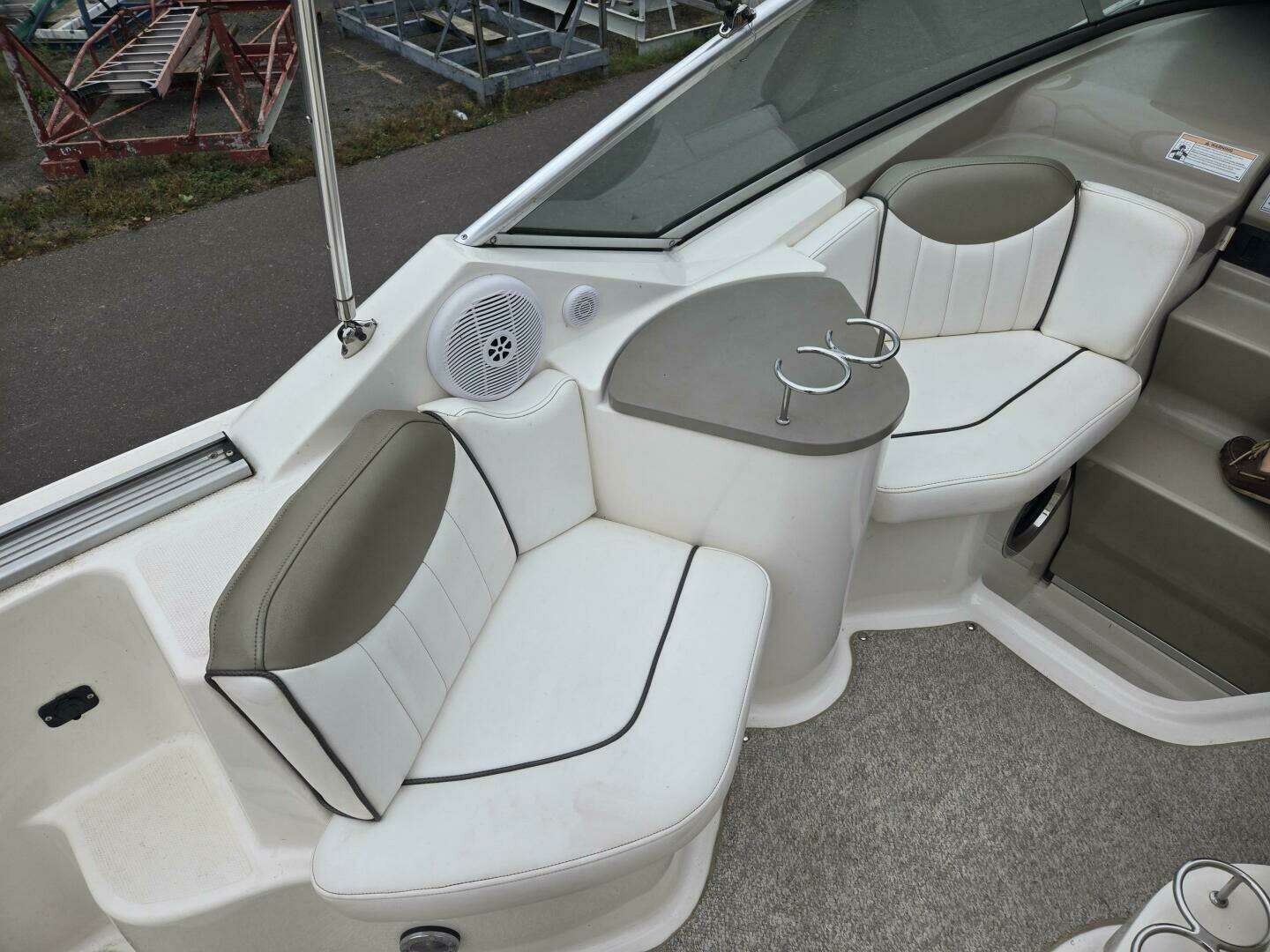 The Sea Ray 240 Sundancer is well built on a solid fiberglass hull with an 8' 6" beam that is easy to trailer. Easy slide acrylic door to access the cabin. The cabin floor plan includes a removable dinette table that can also be converted to a V-Berth. Gally to port features a butane stove and hot and cold pressurized water. The full sized head with shower is to Starboard. The tuck under cabin sleeps 2. On deck seating includes a double helm seat and double aft facing seat. the cockpit seats 6-7 in comfort. There is also a cockpit fridge and sink.