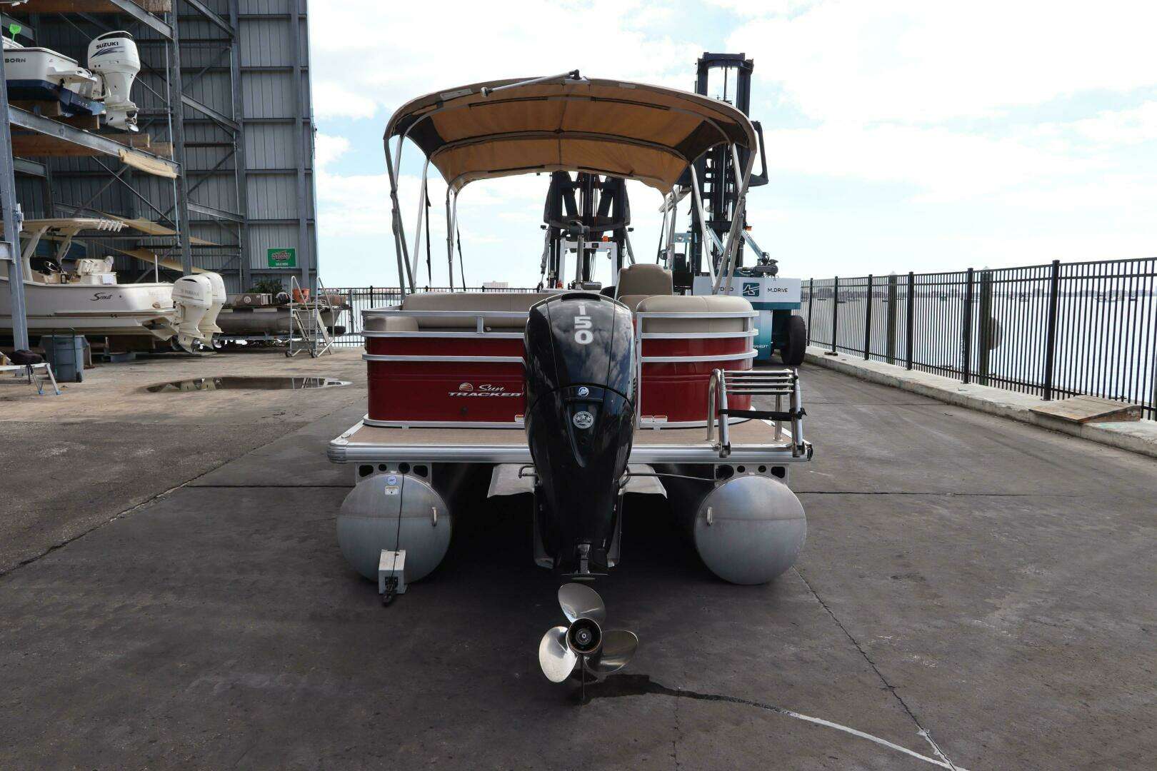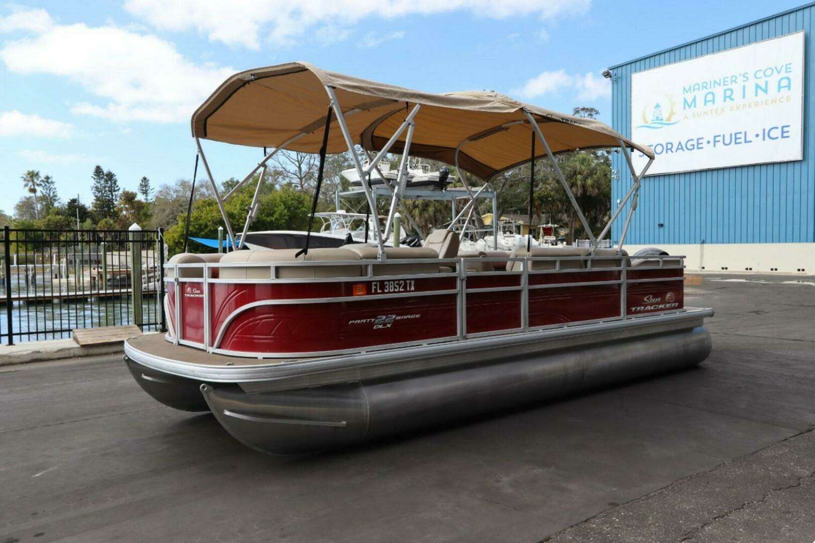 - NEW 10' (3.05 m) SUN TRACKER® QuickLift™ Bimini top w/LED courtesy lights, storage pockets & protectiveboot (color-coordinated Black w/Charcoal fencing or Sand w/Copper Red fencing)