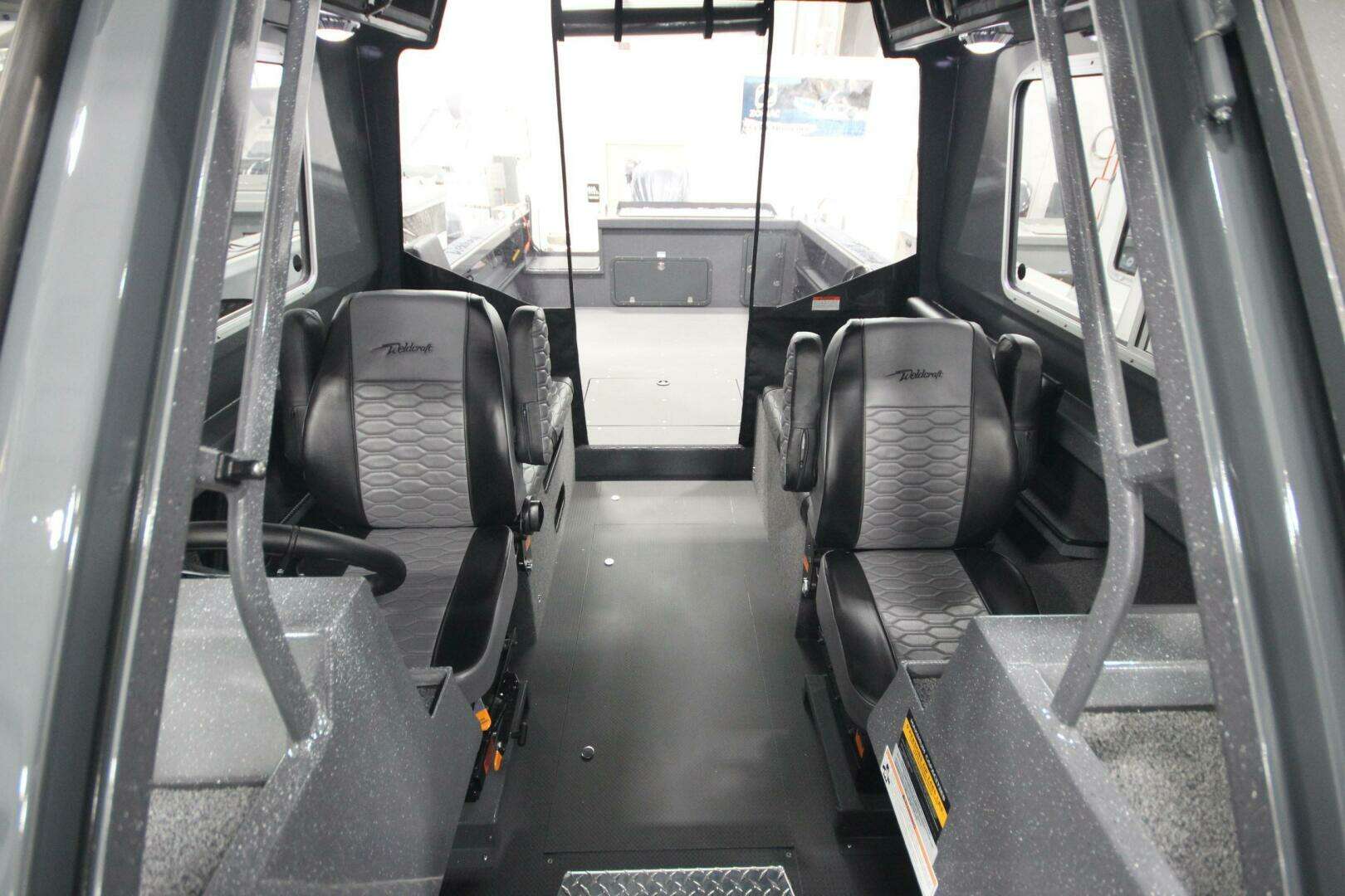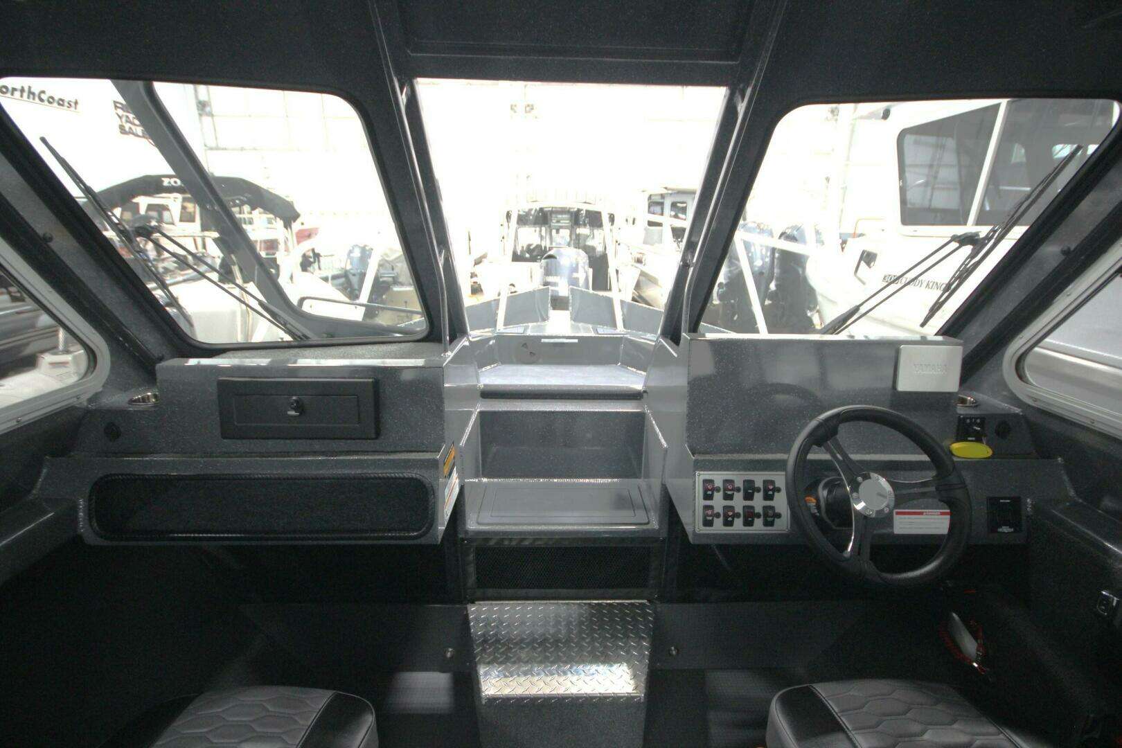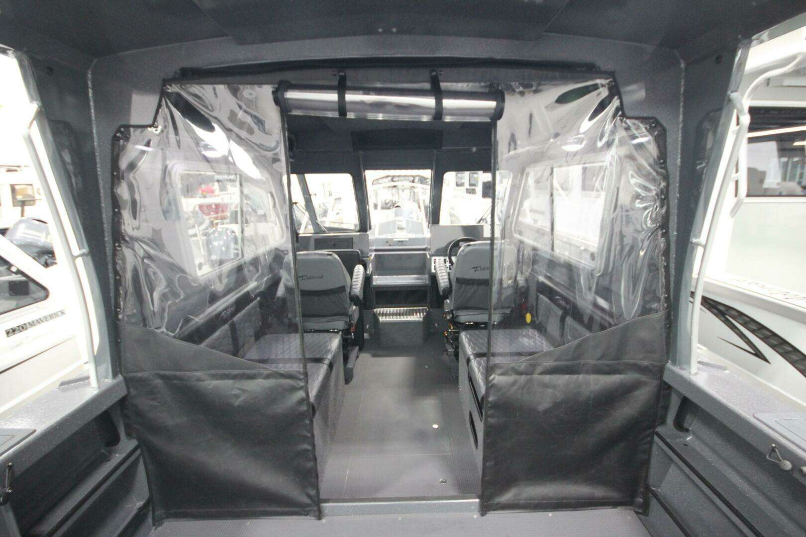Seafaring hard top (88") w/aft leaning windshield, top trays, red/white LED cabin lights, marine grade aluminum slider side windows, 3" top rails, tread plate roof, & clear vinyl backdrop