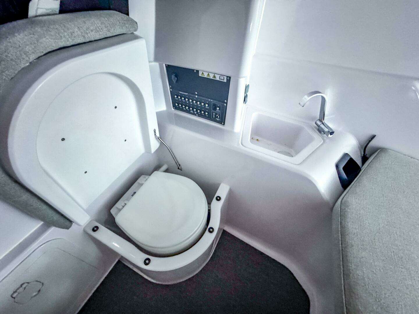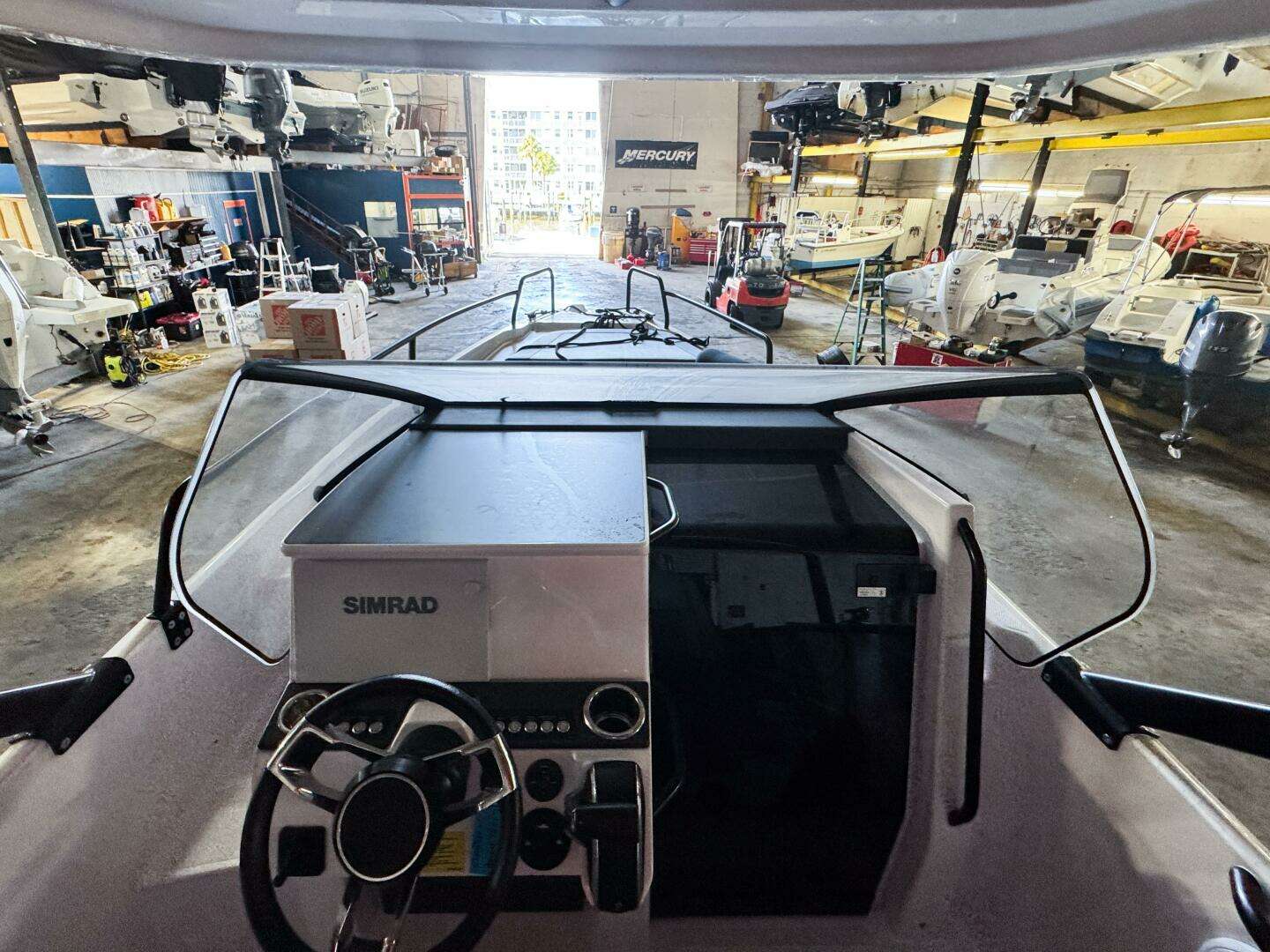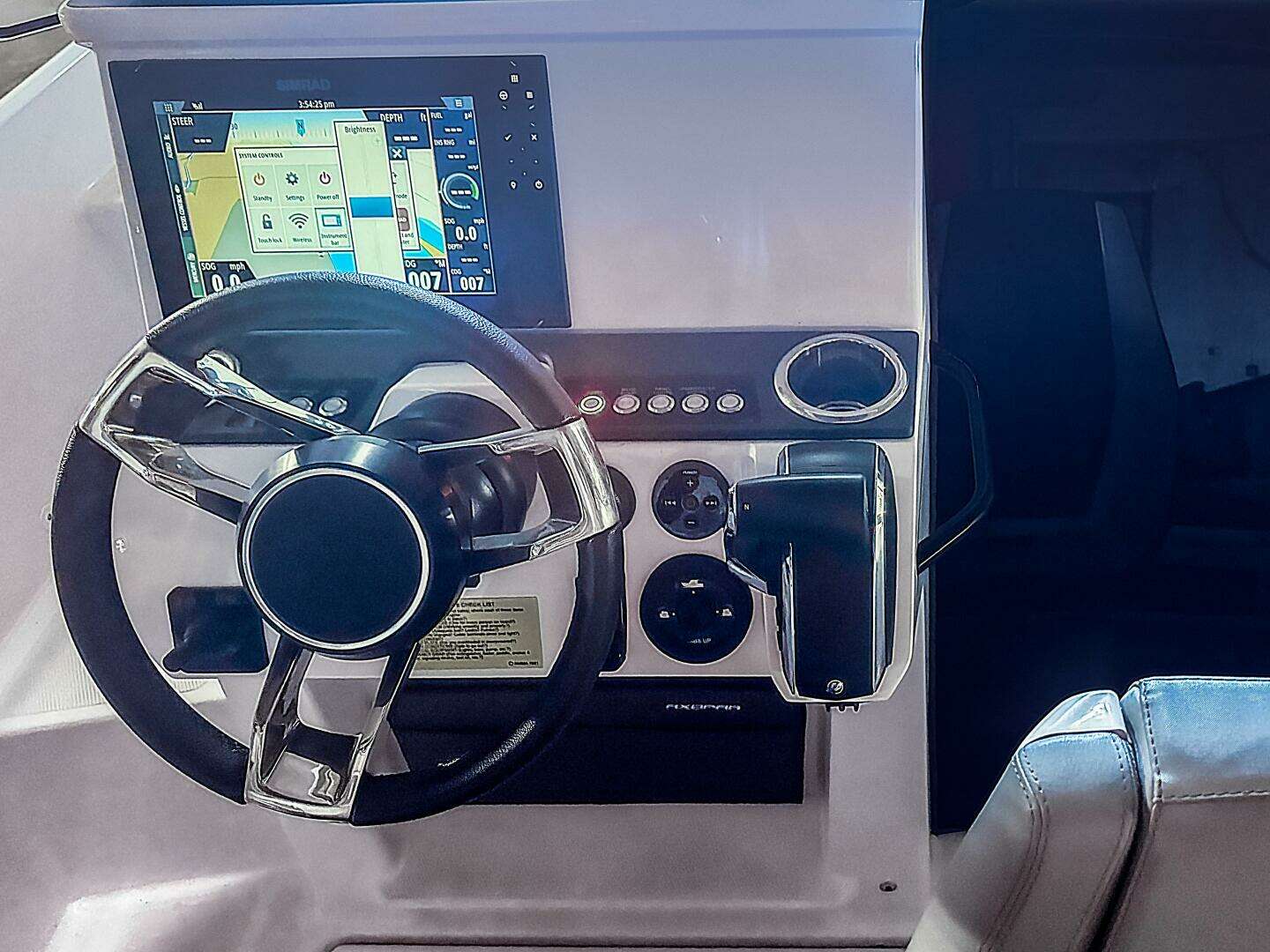 The helm is equipped with bow thruster, chartplotter Simrad NSS 12", Echo Sounder through hull, trim tabs, Steering console switch panel, and USB charging port. The wide helm console and front screen offer a helm seating area with more space and room for step through entrance to the front cabin in style.