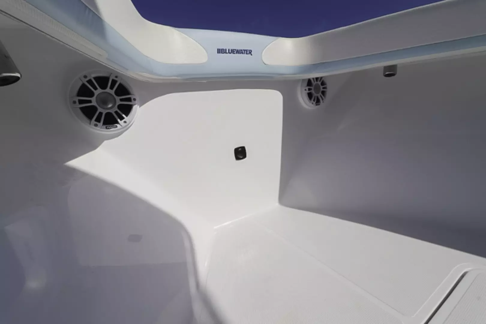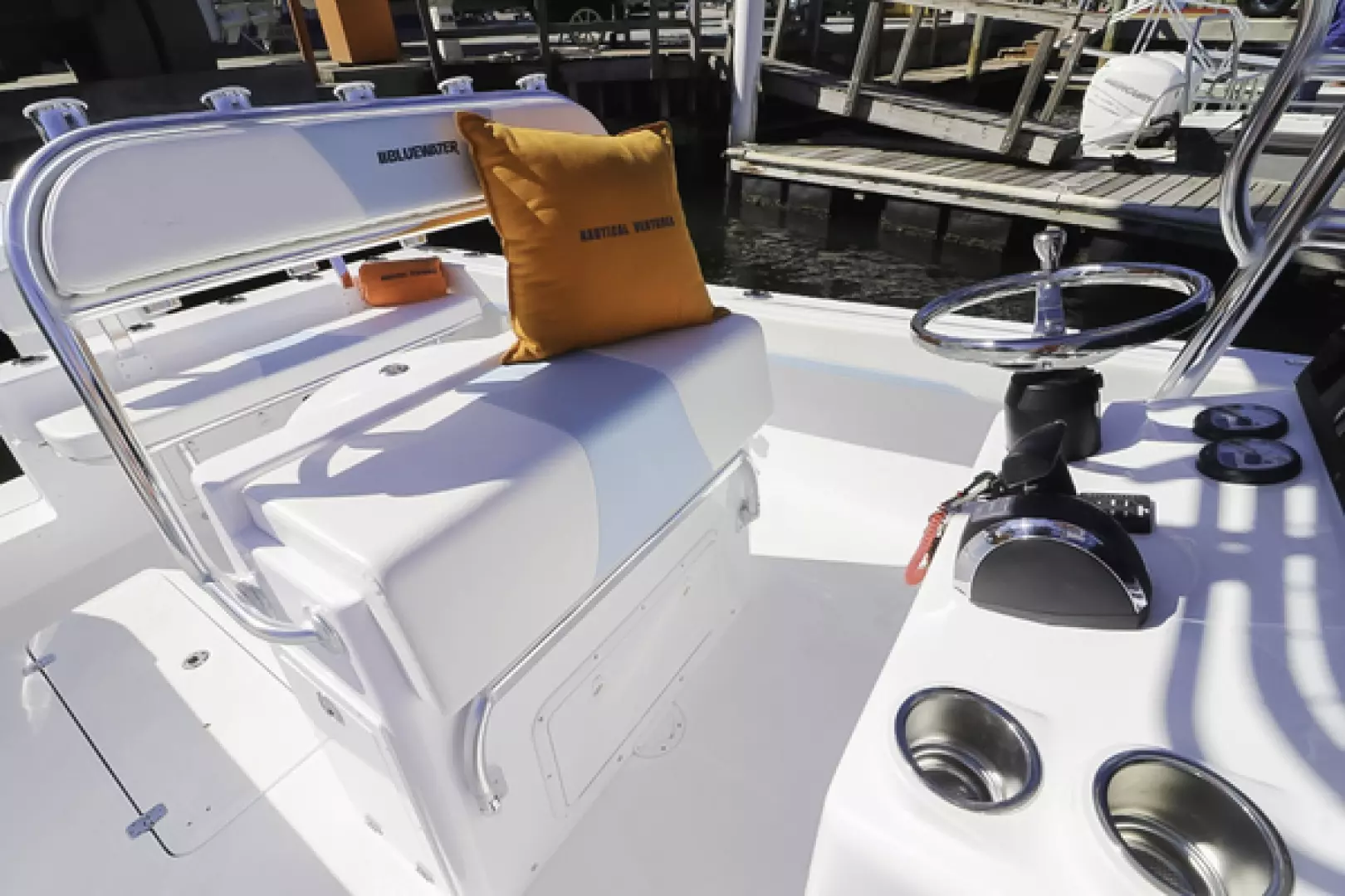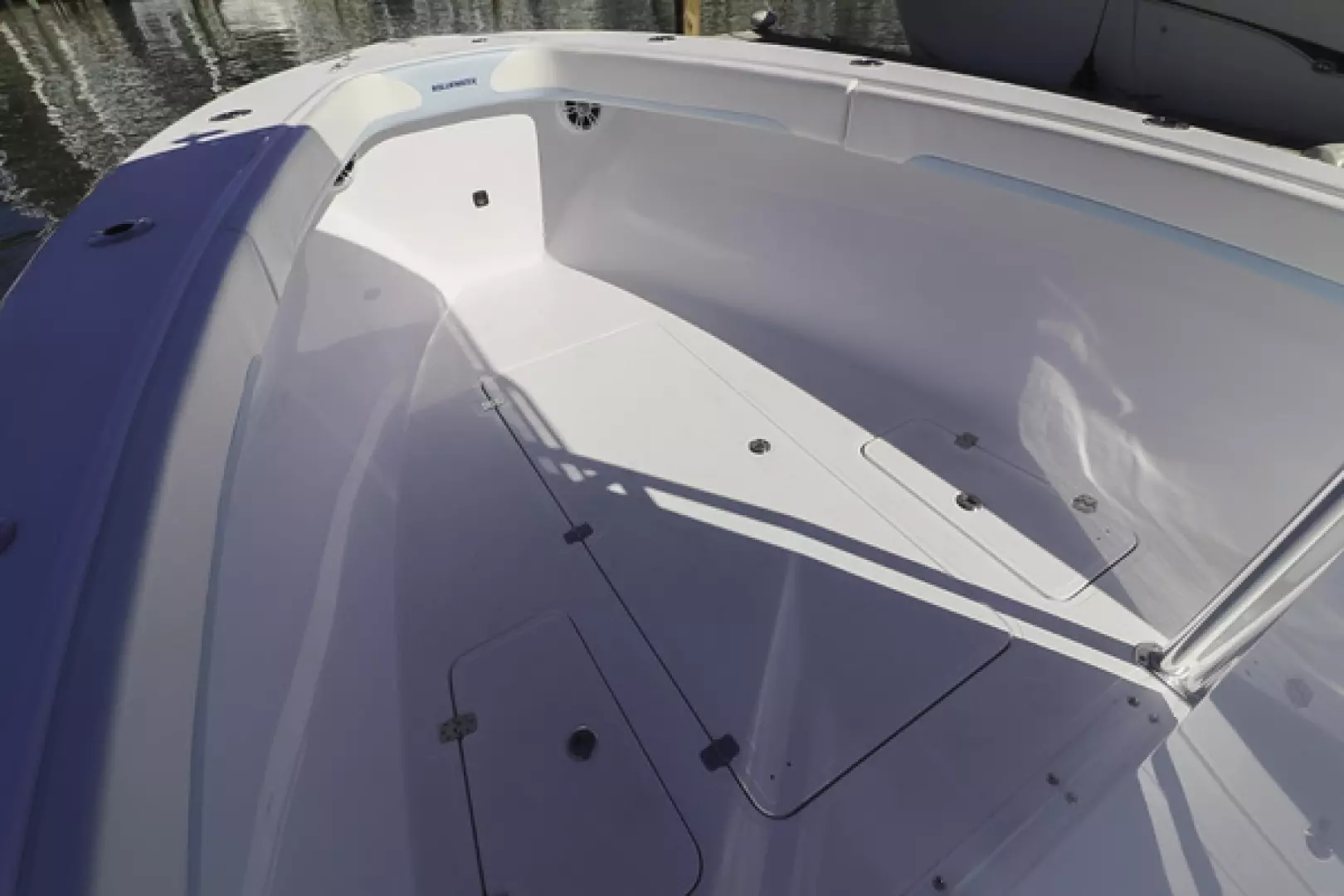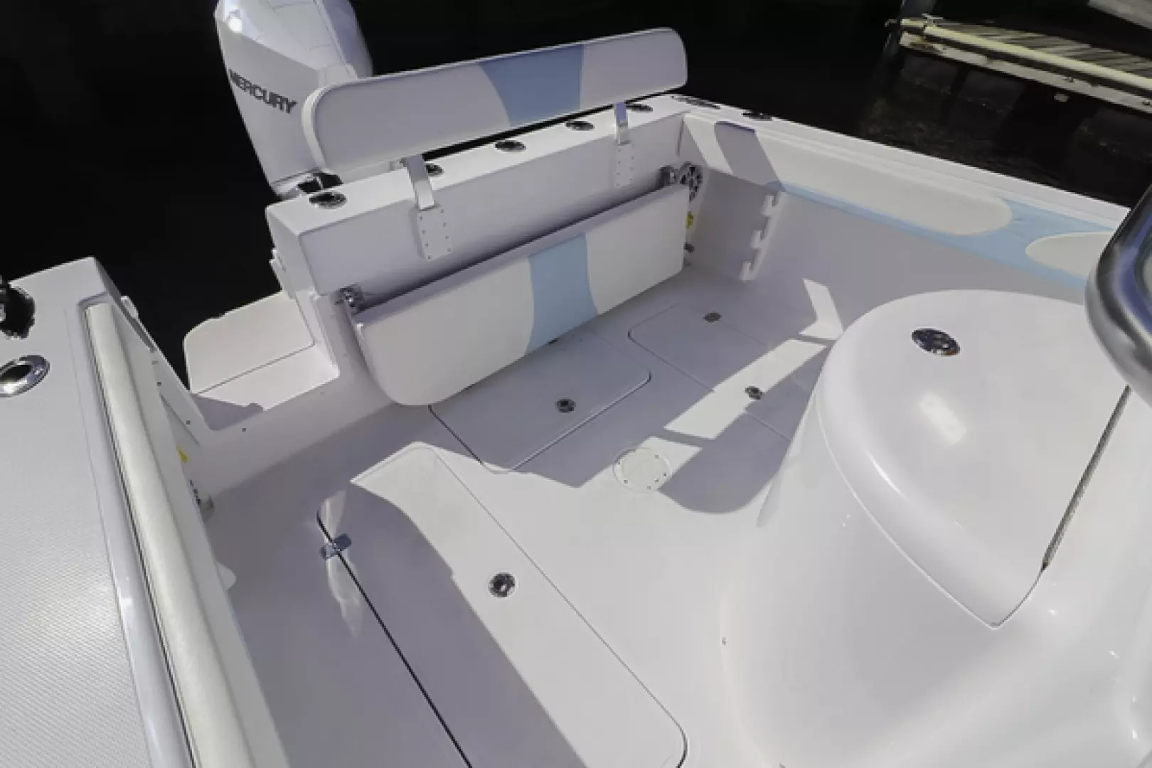 Other features include a custom aft seat, upholstered leaning post, fold-down footrest, full bolster cushions, 40” Armstrong swim ladder, blue underwater lights, forward and aft LED spreader lights, life jacket storage, LED cockpit lights, freshwater system, Lenco trim tabs, Fusion stereo speakers, Fusion amp, forward anchor locker, aft bilge access hatch, raw water washdown outlet, six 8” pop-up cleats, and two forward storage lockers.