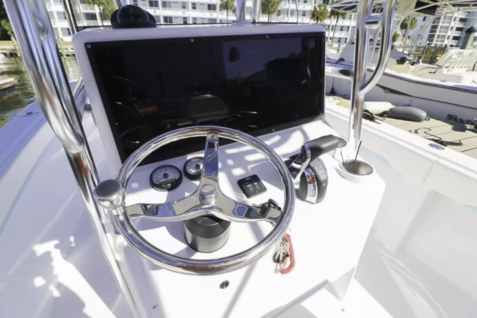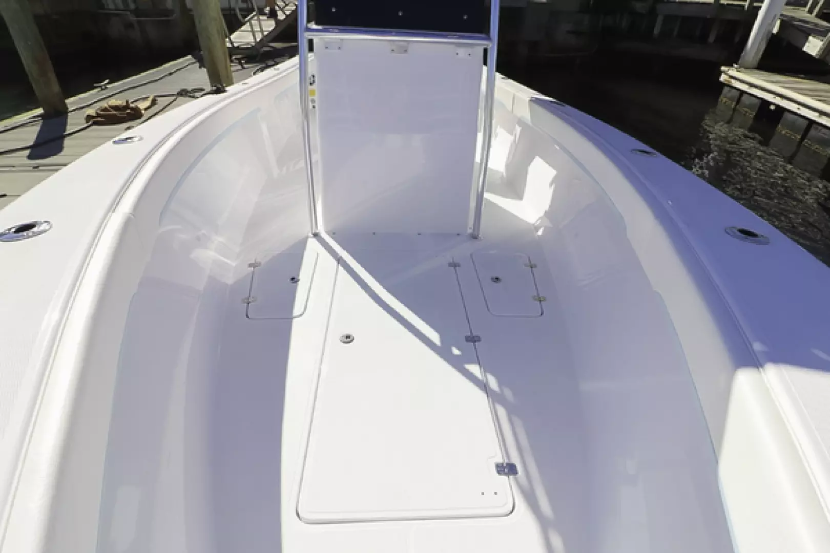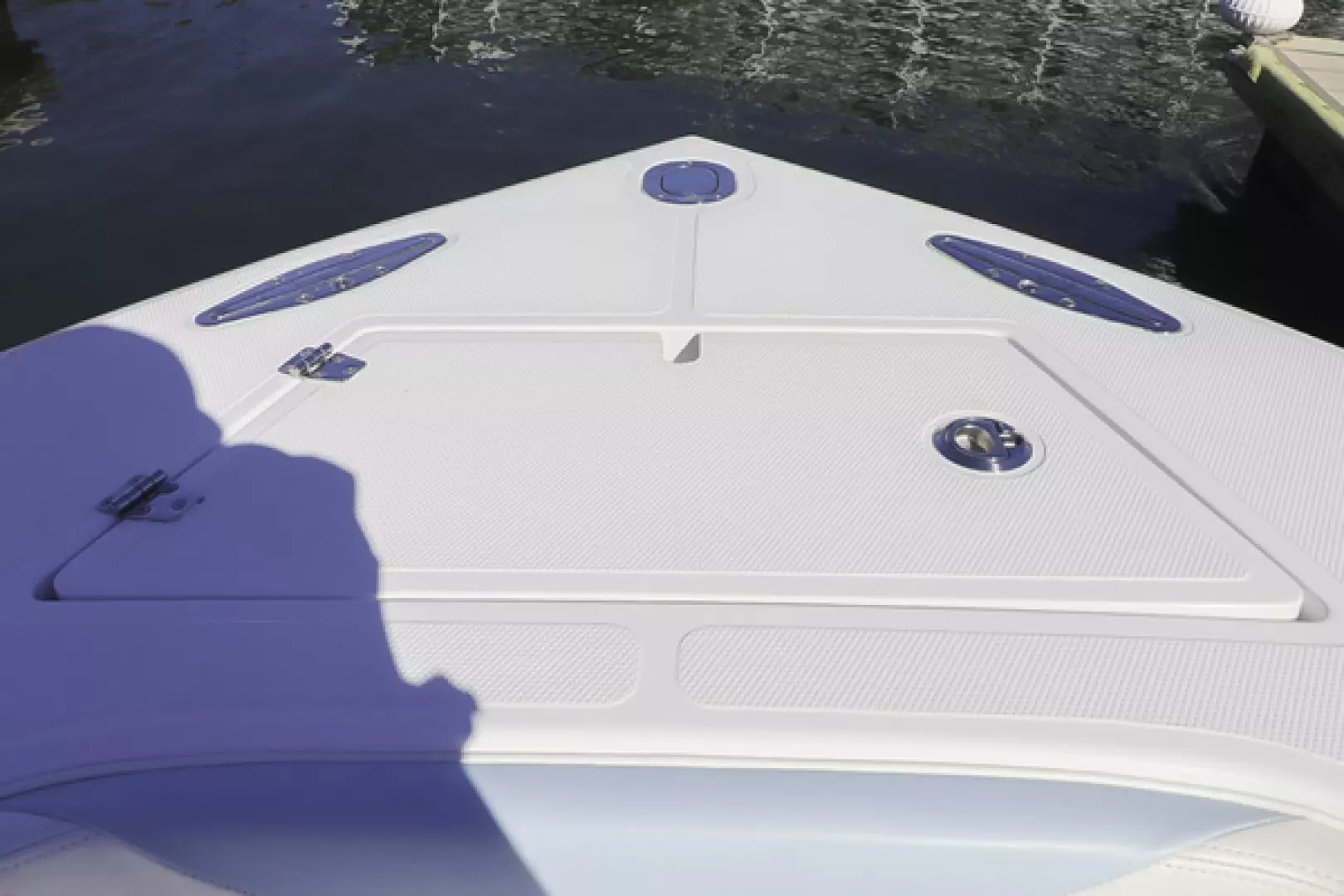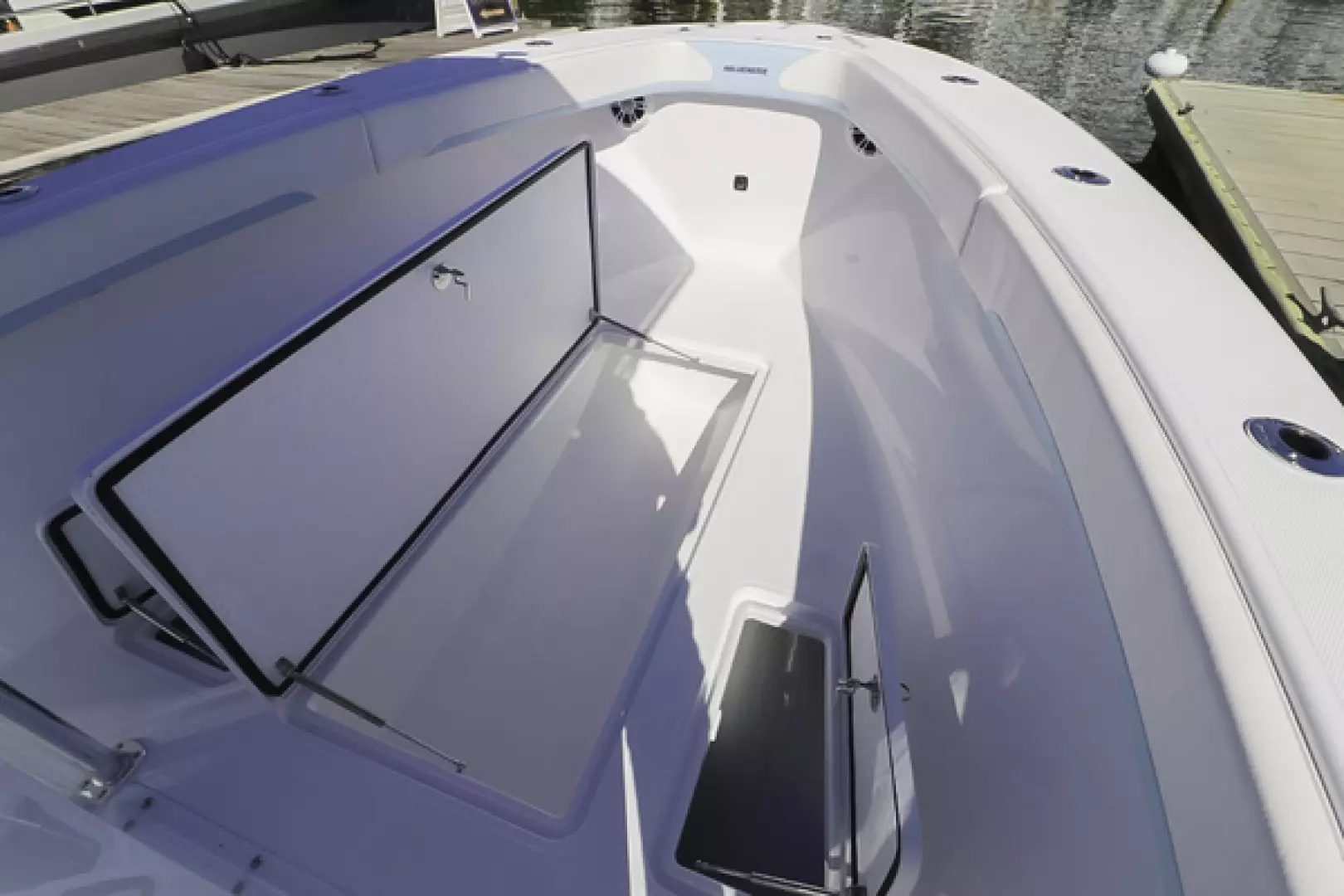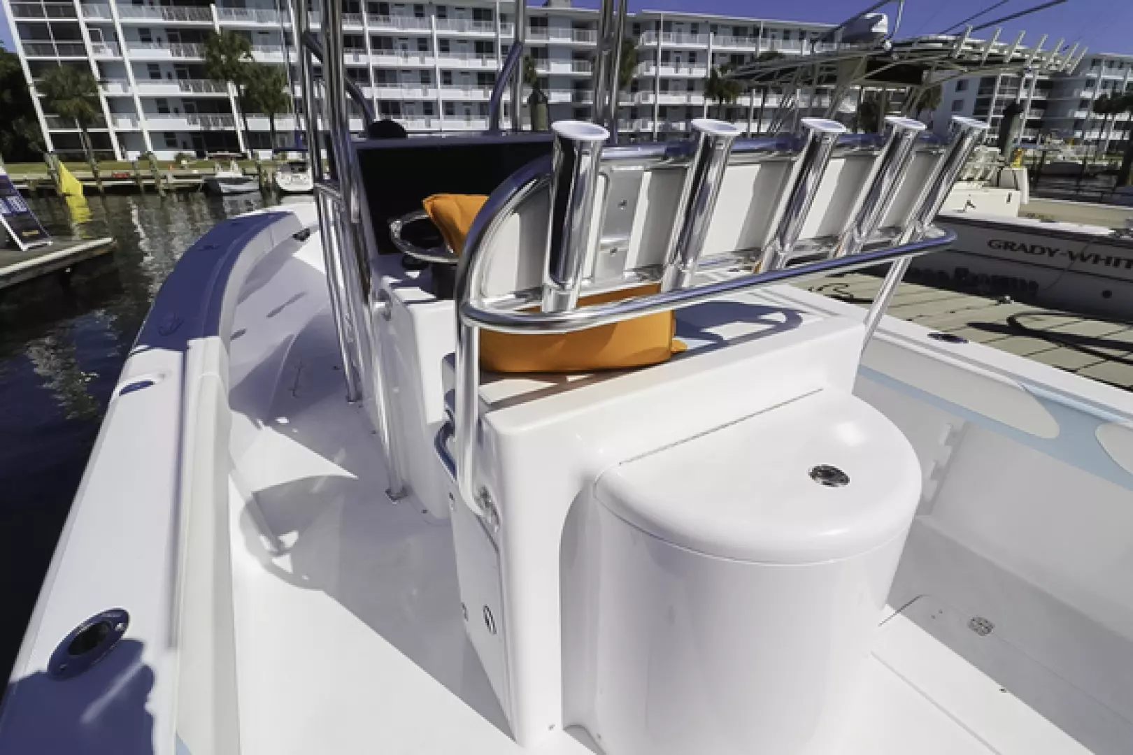 Other features include a custom aft seat, upholstered leaning post, fold-down footrest, full bolster cushions, 40” Armstrong swim ladder, blue underwater lights, forward and aft LED spreader lights, life jacket storage, LED cockpit lights, freshwater system, Lenco trim tabs, Fusion stereo speakers, Fusion amp, forward anchor locker, aft bilge access hatch, raw water washdown outlet, six 8” pop-up cleats, and two forward storage lockers.