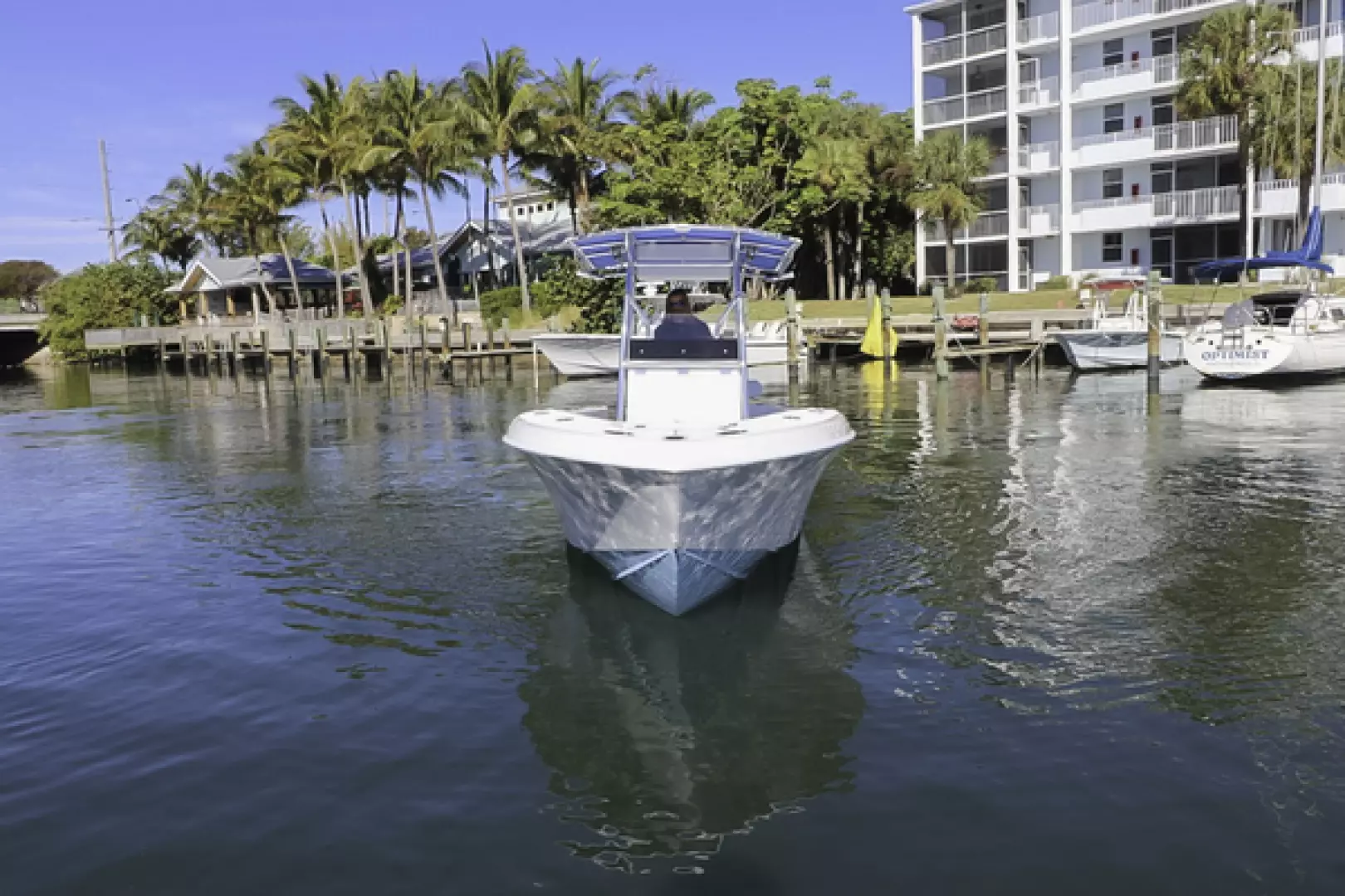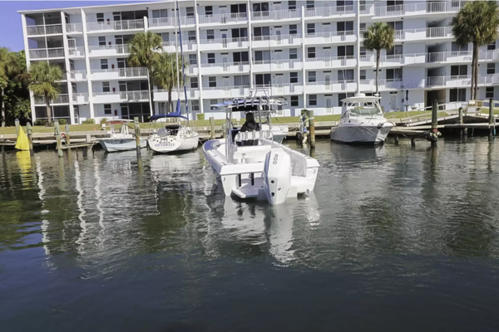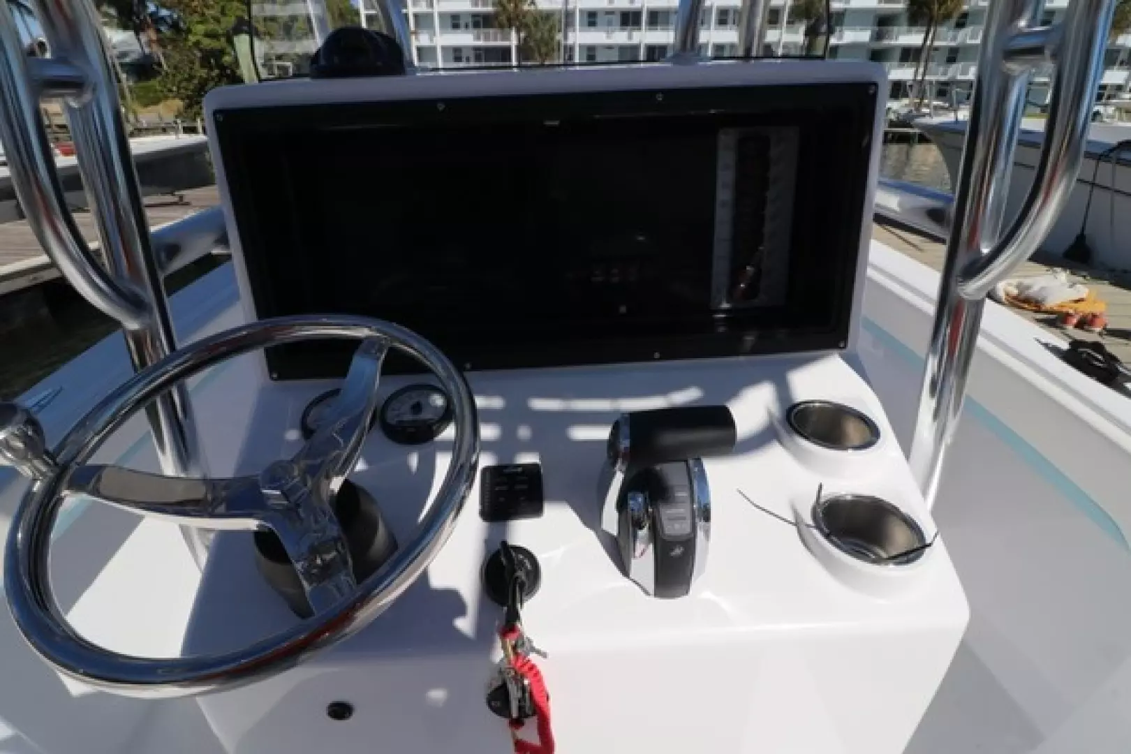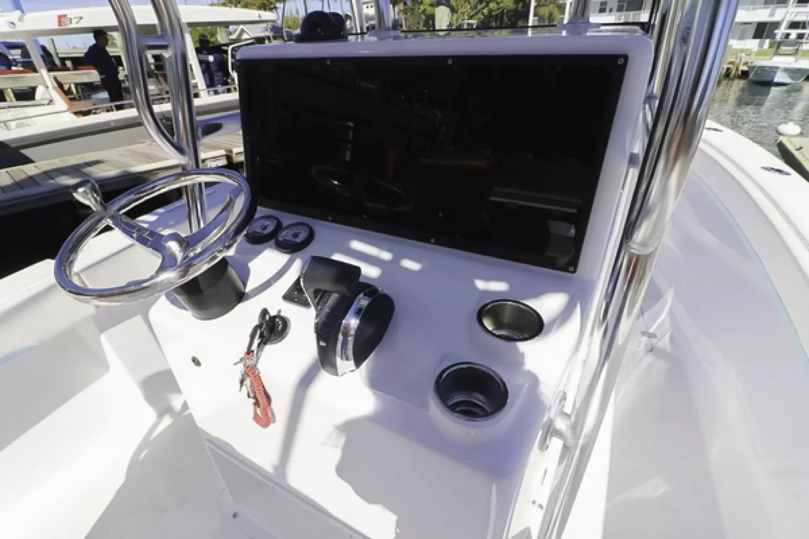 Other features include a custom aft seat, upholstered leaning post, fold-down footrest, full bolster cushions, 40” Armstrong swim ladder, blue underwater lights, forward and aft LED spreader lights, life jacket storage, LED cockpit lights, freshwater system, Lenco trim tabs, Fusion stereo speakers, Fusion amp, forward anchor locker, aft bilge access hatch, raw water washdown outlet, six 8” pop-up cleats, and two forward storage lockers.