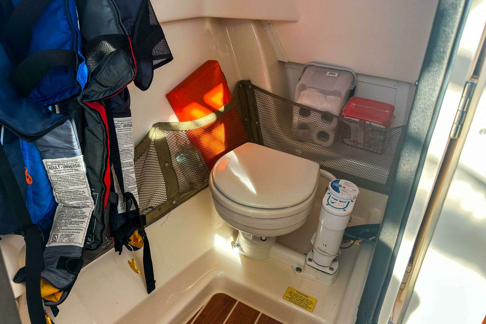 - Head - lockable console w/dome light, bulk storage, mirror w/shelf, portable head & teak and holly sole