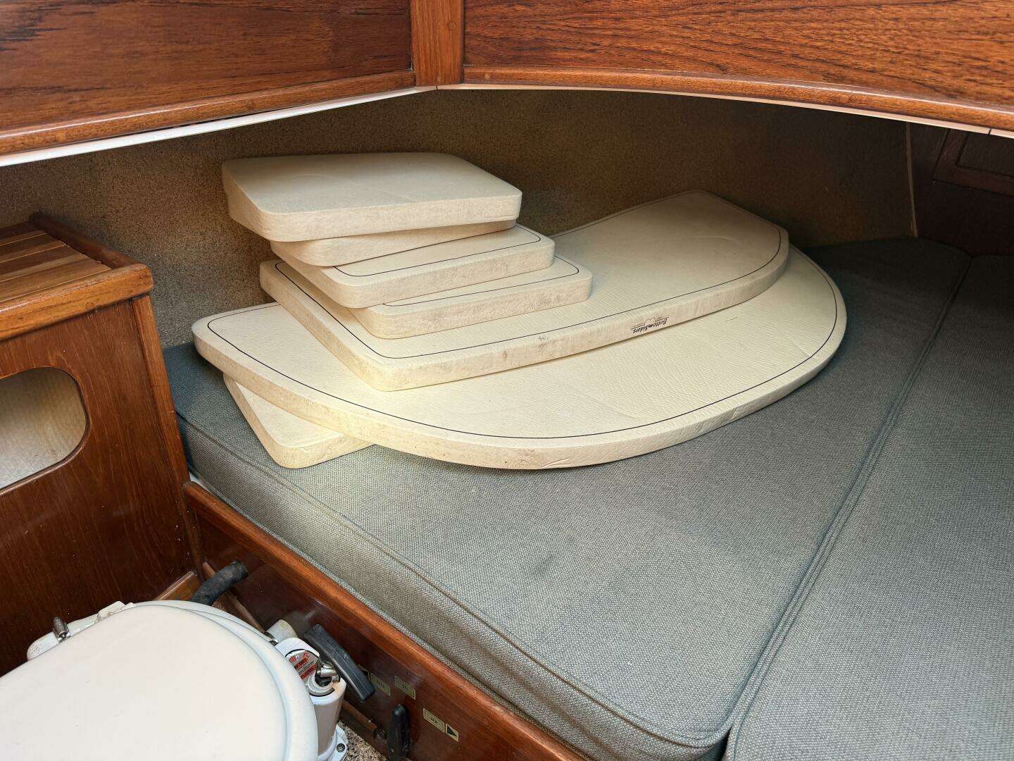 At first glance, she looks purposeful: a full keel, a sweet sheer line, traditional overhangs, and a bowsprit that hints at bluewater ambitions. She’s not a big boat — just over 24 feet on deck (and closer to 28 feet overall, counting the bowsprit) — but the clever layout makes her feel roomier than the numbers suggest. Down below, you’ll find a surprisingly practical cabin with berths for two or three, a functional galley, and just enough teak trim to feel warm without being fussy. Storage is abundant for a boat her size, and the workmanship, especially in older models, is genuinely solid.