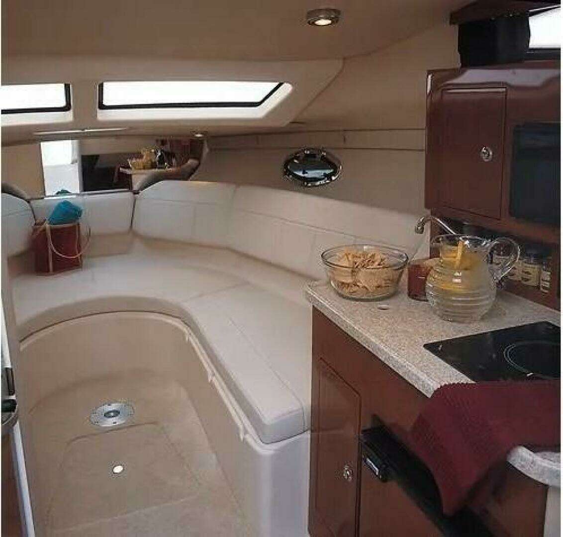 There are more cubic feet of livable interior space in this 25 Express than in Express Cruisers two feet longer. It is lighter, brighter and airier than any conventional trailerable cruiser. The large, windowed main cabin offers a comfortable dining area that converts to an oversized berth. There is a full standup head compartment, and the galley is complete with stove, sink with pressurized water, refrigerator, microwave and Corian countertop. The mid-cabin comfortably accommodates children or adults in the large berth. All this in a 25-foot trailerable cruiser that offers the highest level of standard equipment. Equipment you would pay for as options on similar cruisers. The stand-up head compartment contains an integrated sink with hot and cold pressurized water, generous storage and a Jabsco Electric Flush head.
