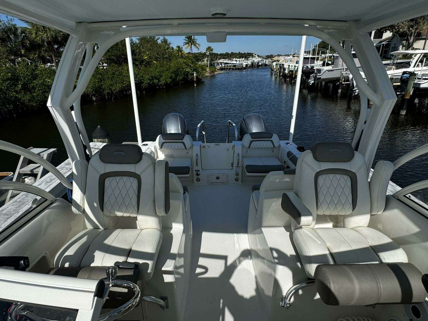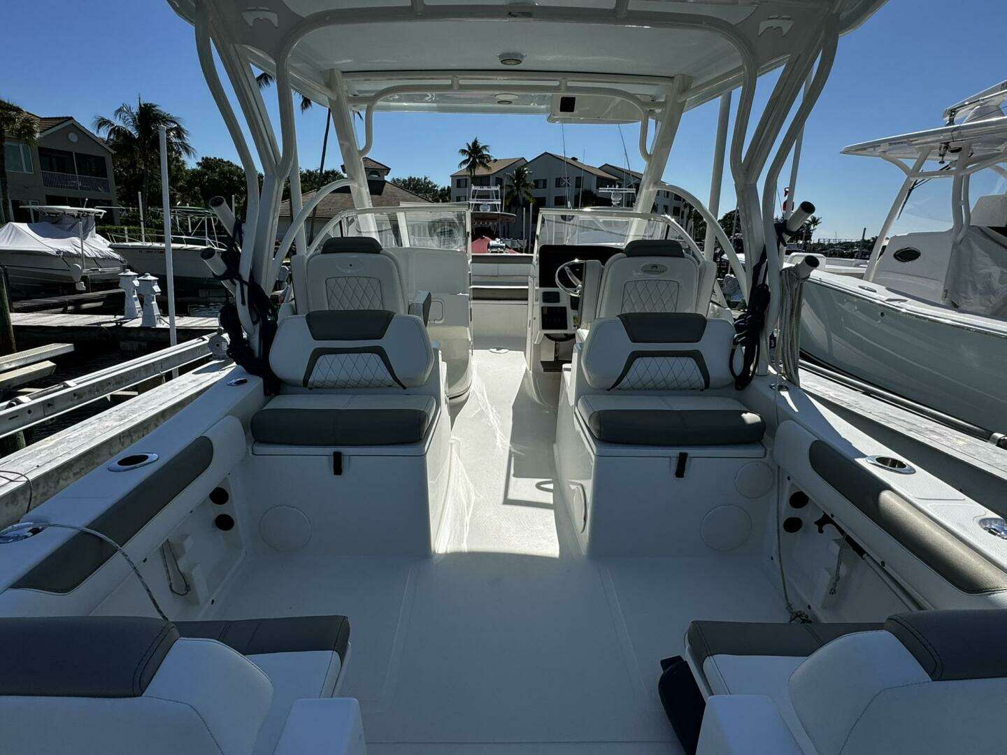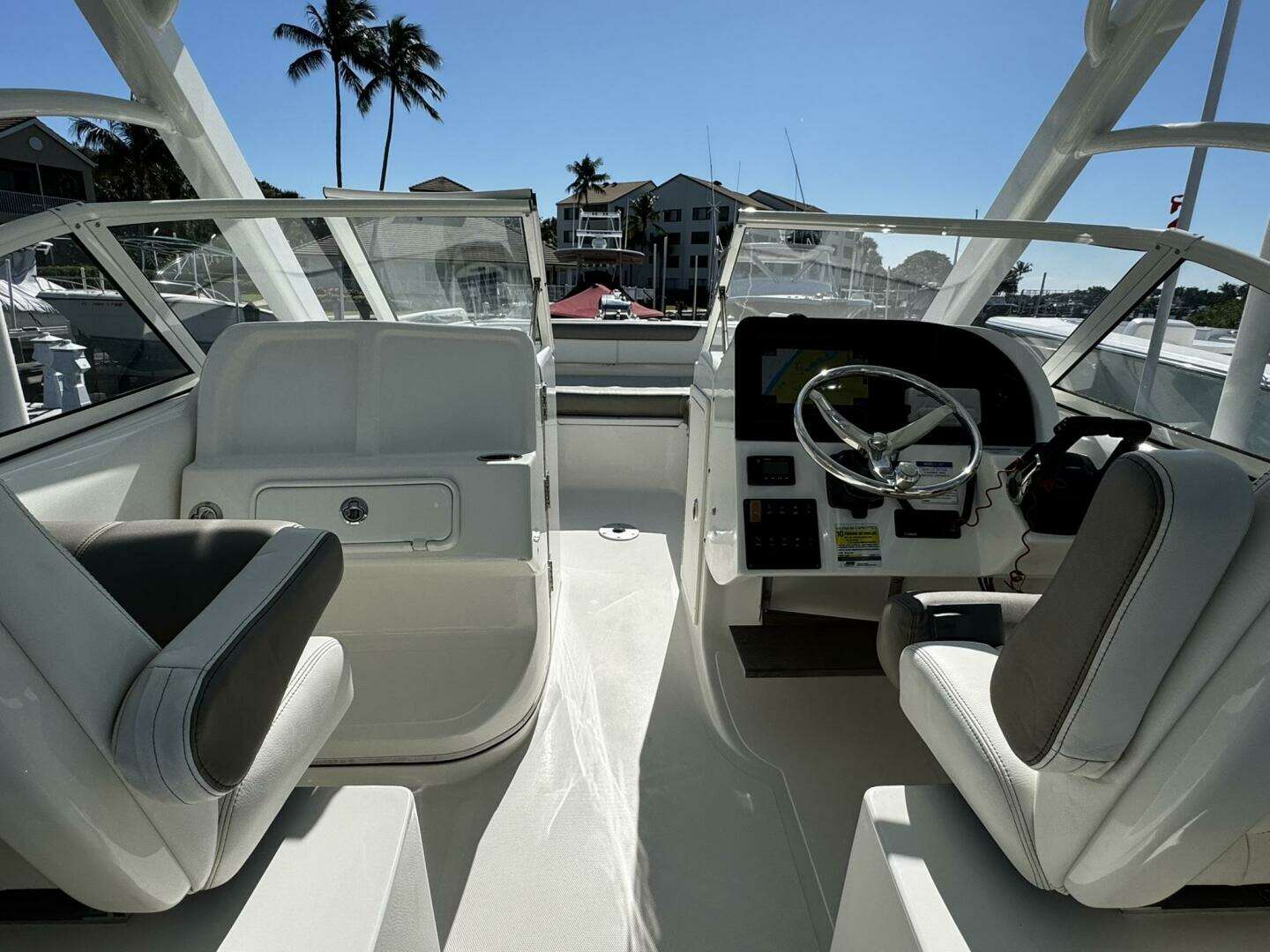 - Helm and passenger dual custom seats with flip-up bolsters and recessed stainless steel cup holders