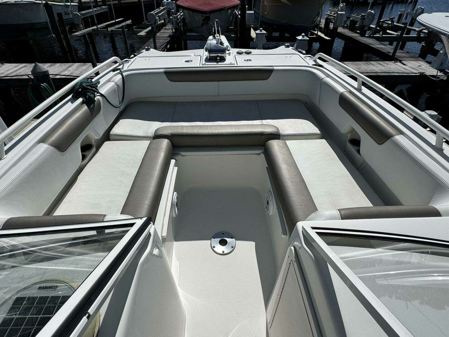 - Forward sun lounge featuring port and starboard cushioned seats for 6 adults with wraparound coaming pad seat backs