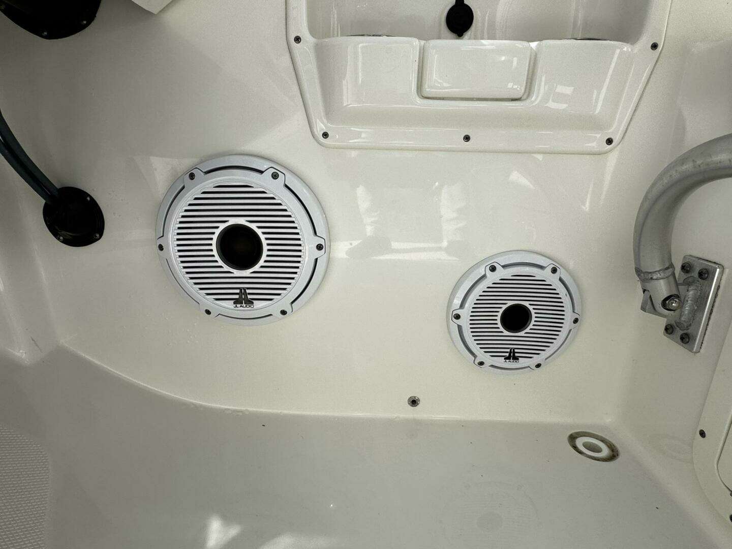 - Starboard seatbox houses 30-gallon insulated livewell with a 1100-gph magnetic drive pump and overboard drain